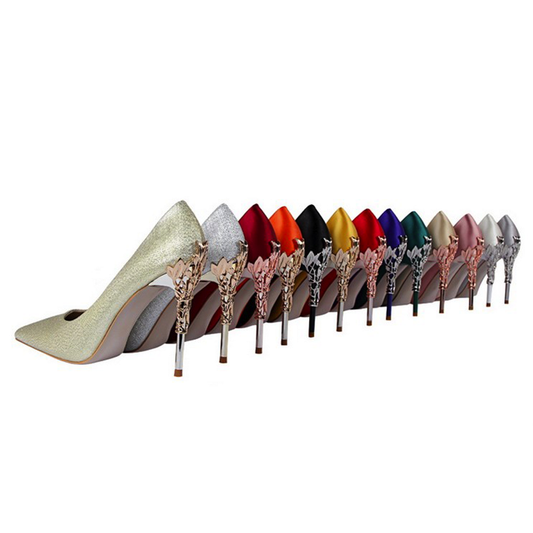 Funki Findz | Shoes | Women's Silk Stilettos | Metal Carved Heels