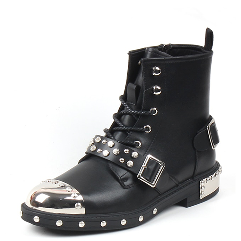 - Made from high quality genuine leather with round steel cap toe, metal plates, studded rivets, buckle straps, lace up front and side zip up closure, low chunky capped square heel, and seam detailing, they provide both comfort and support for you during your busy day.