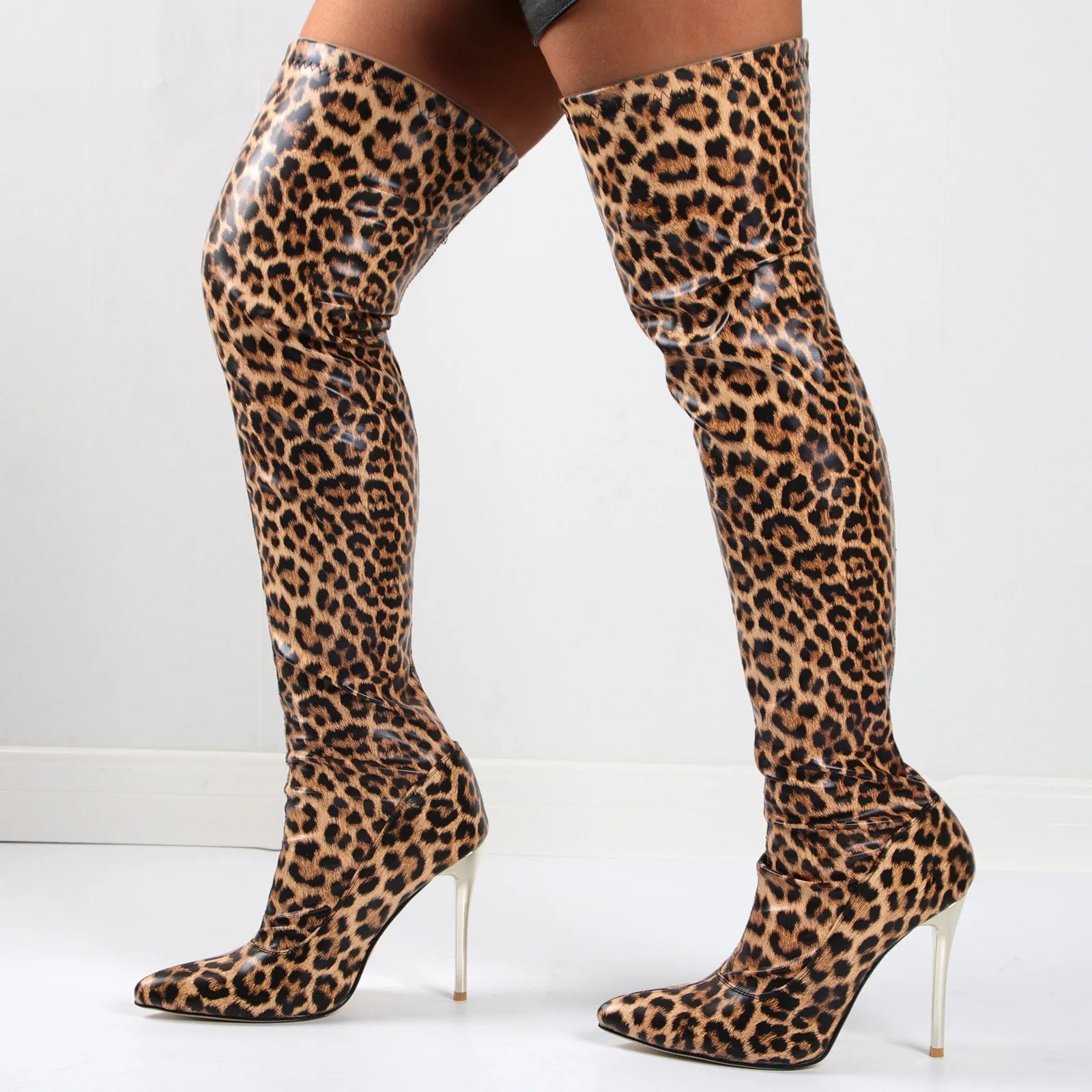 - Glamorous and a bit risque' you will get noticed walking into a room with these gorgeous over-the-knee high boots. Super soft and comfortable they are made of quality PU leather and feature pointed toe, super high stiletto heel, pull on closure with side ankle zip, snake print, leopard print, boho and floral print design, and non-slip rubber soles.