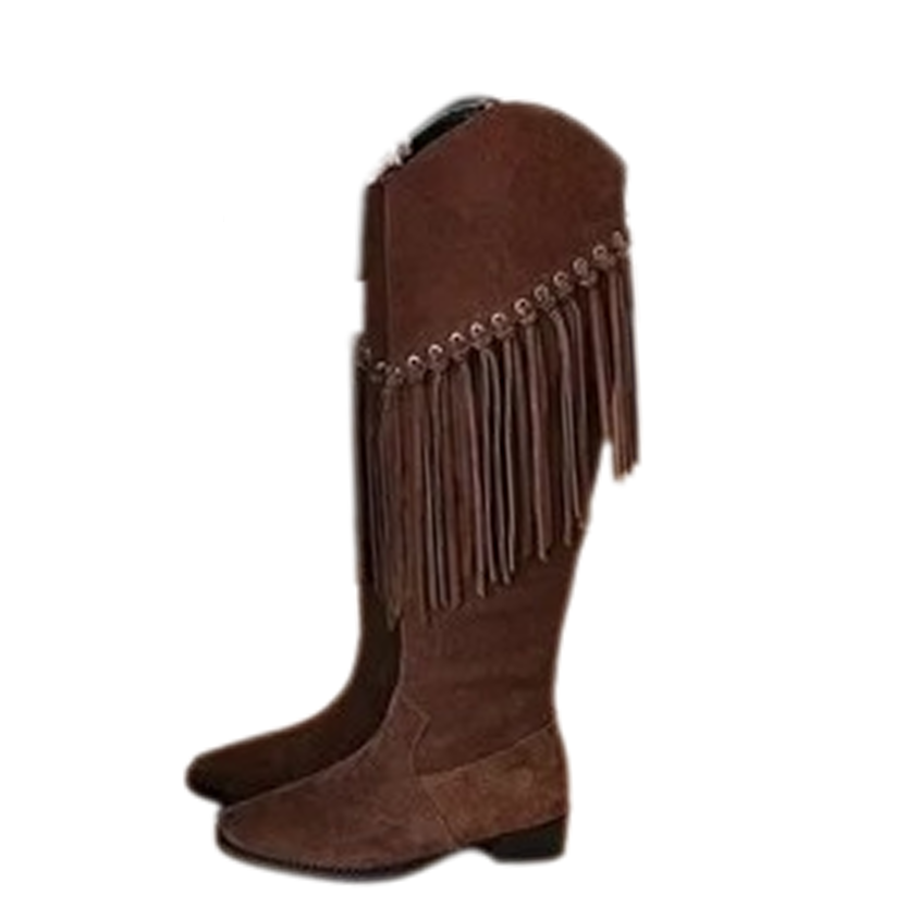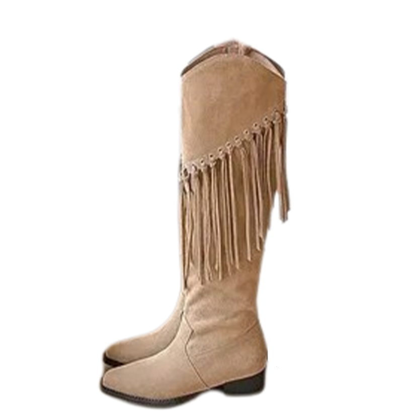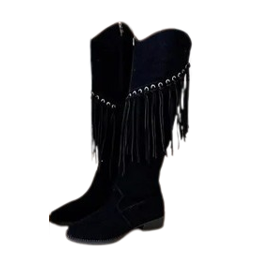 - Glamorous and a bit risque' you will get noticed walking into a room with these western mid calf skinny boots. Super soft and comfortable they are made of quality Genuine Suede leather and feature pointed toe, square block flat heels, pull on design with side zip closure, fringe tassels and seam detailing.