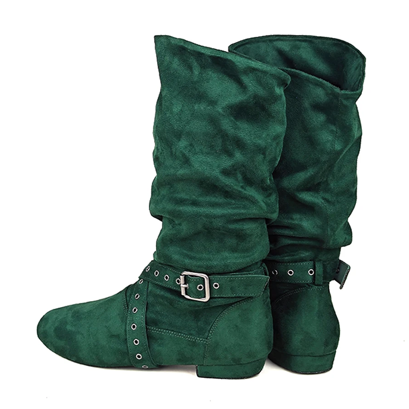 Cozy meets contemporary with these stylish, flat, mid-calf suede boots.
