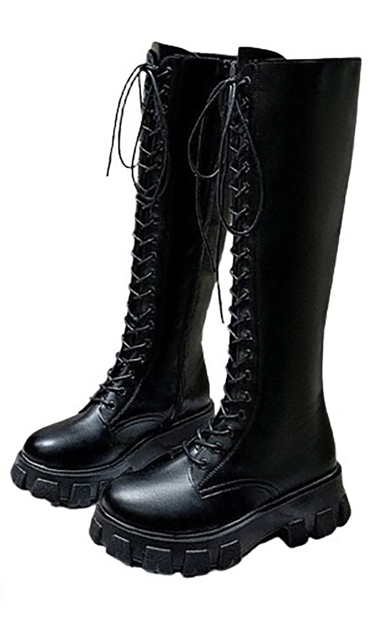 - Made from quality faux PU leather and featuring chunky, cleated, anti-skid platform soles, round toes, outer lace up closure with inner zip closure and seam detailing, these chunky combat style boots are sure to please.