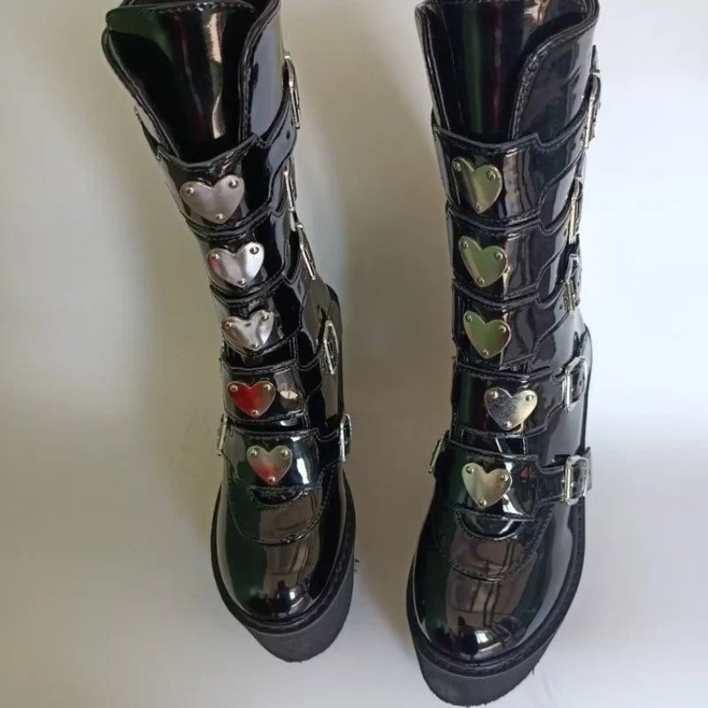 - Made from quality faux PU leather and featuring decorative heart shaped front plates, chunky, cleated, anti-skid platform soles, round toes, with side buckle straps, back zip closure and seam detailing, these medium high chunky boots are sure to make you stand out in a crowd.