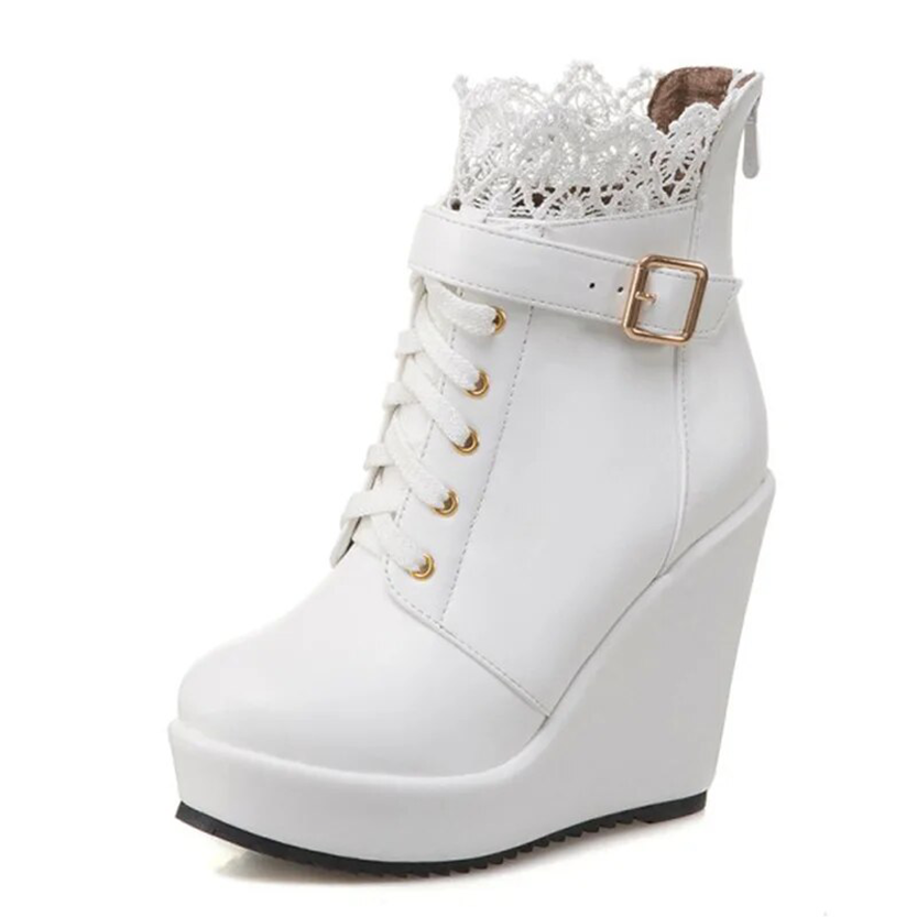 - Our Victorian-inspired retro-renaissance style booties are crafted in beautiful PU leather and applique and feature pretty lace frilled top, front lace-up design with inside zipper closure, decorative buckle ankle strap, rounded toe, cushioned inner, ankle rise, seam detailing, chunky wedge super high heels, and anti-slip rubber soles, make these shoes feel like you're walking on air. Super comfortable and easy to walk in, you will want to wear them all day, every day.