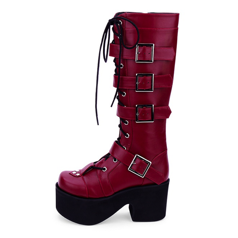 Gothic Punk Platform Boots, Knee High, High Chunky Platform Boots, Riding Boots, Long Boots, Zipper Boots. Biker Boots, Punk Goth Cosplay Boots Women Burgundy Leather Buckle Straps Lace Up High Boots.