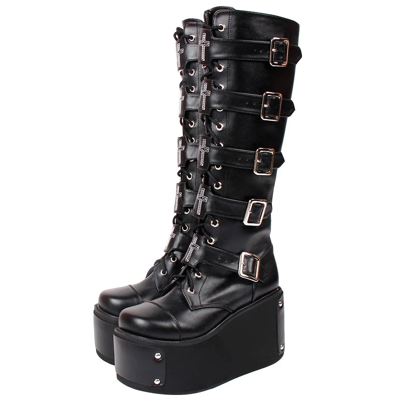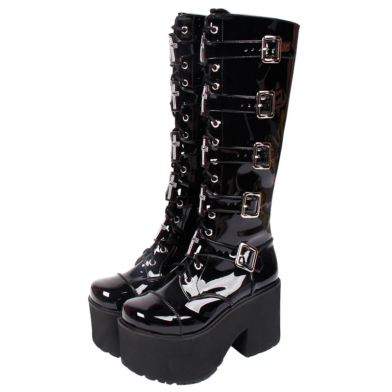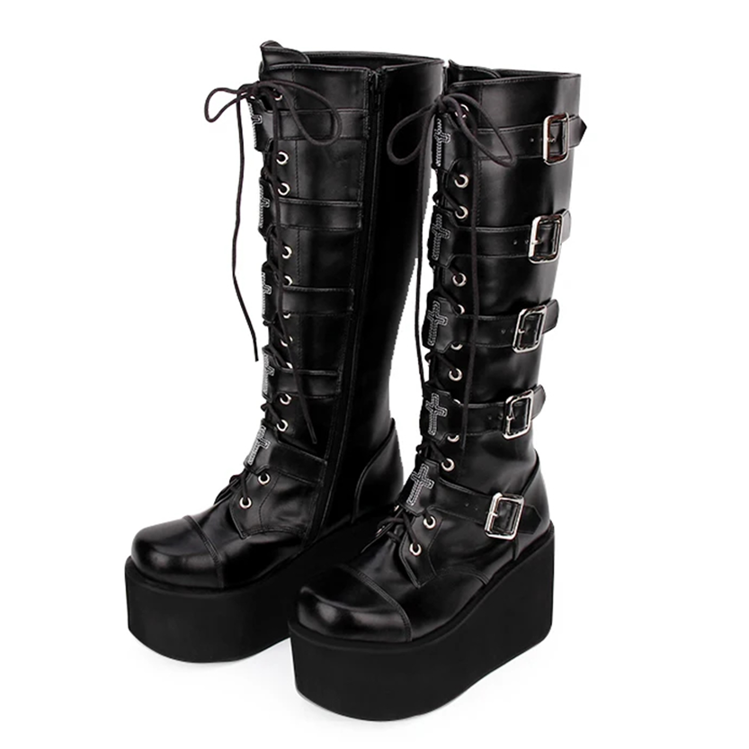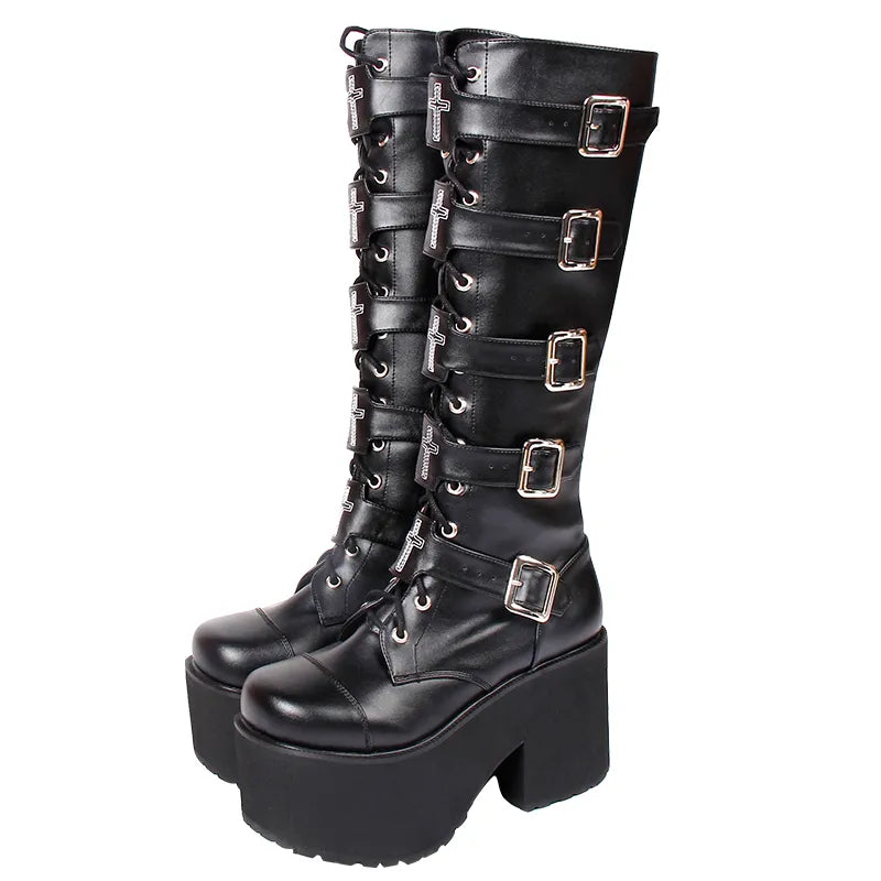 Gothic Punk Platform Boots, Knee High, High Chunky Platform Boots, Riding Boots, Long Boots, Zipper Boots. Biker Boots. Cosplay Boots Women Black Leather Buckle Straps Lace Up Gothic Punk High Boots.