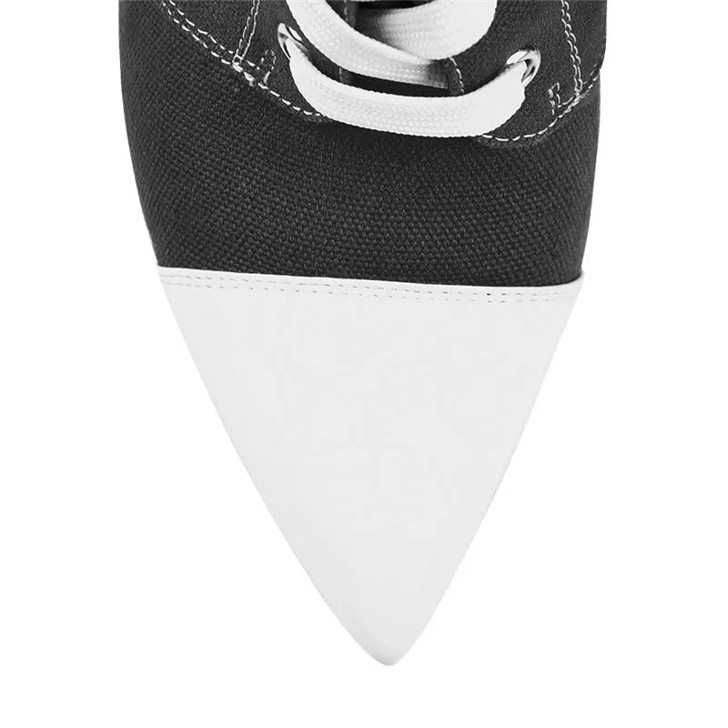 - These handmade, knee-high boots feature front lace-up design and inside zipper closure, pointed toe, ankle rise, thin 5 inch stiletto metal heels, and anti-slip rubber soles. Not only will they add extra height but will certainly make you stand out from the crowd.