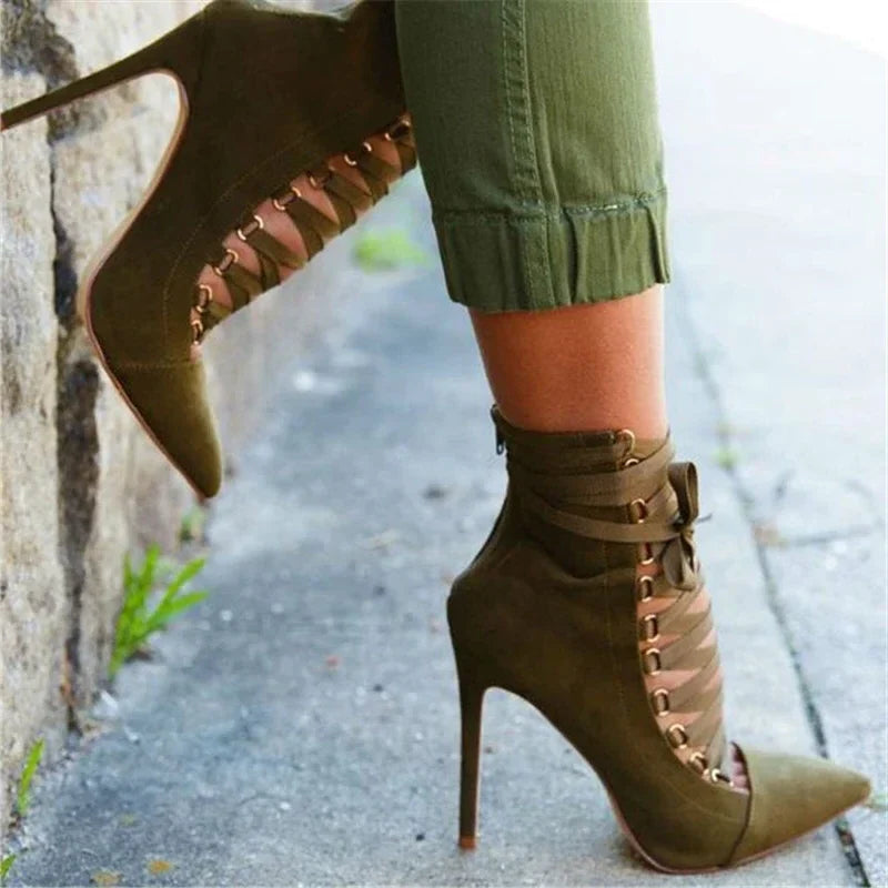 - Made from quality faux PU Suede Leather and featuring, lace up design pointed toe, high top lace up closure, anti-skid platform soles, and finished with elegant high thin stiletto heels, these glamorous booties will be sure to please.