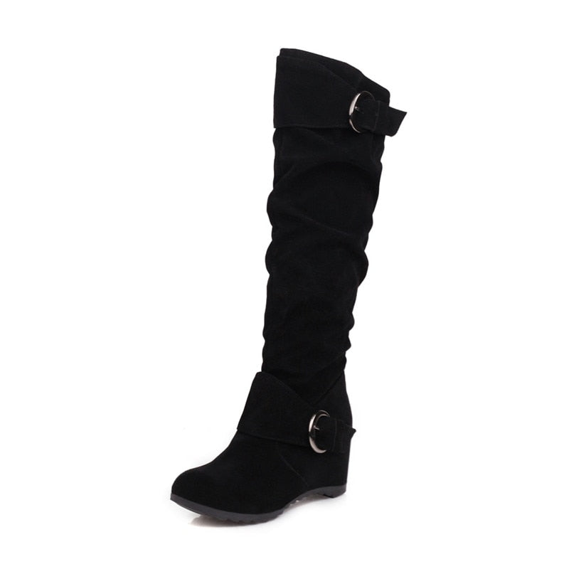 - Glamorous and a bit risque' you will get noticed walking into a room with these gorgeous boots. Super soft and comfortable they are made of quality PU suede leather and feature round toe, gentle supportive arch, fitted straps, metal decorative buckles, full inner side zip and seam detailing these boots are a must have item for any wardrobe.