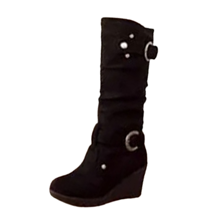 - Made from quality faux plush PU Suede Leather and featurie round toes, wedge heel, 2 strap design, decorative metal studs, pull on and side zip closure and seam detailing they offer a snug but perfect fit while making them super easy to put on and take off.