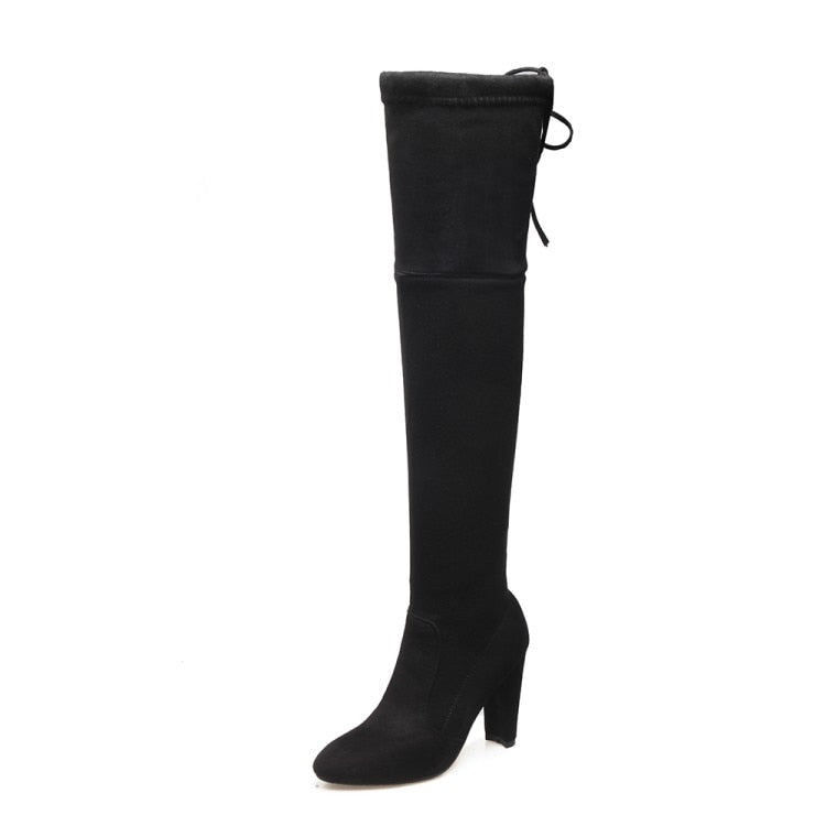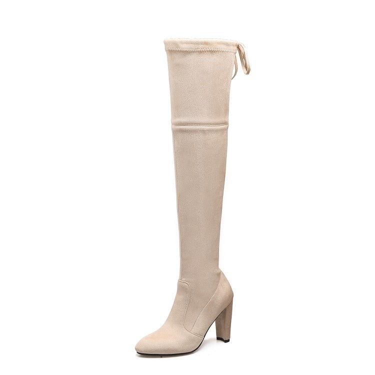 - Glamorous and a bit risque' you will get noticed walking into a room with these gorgeous over-the-knee skinny boots. Super soft and comfortable they are made of quality Suede PU leather and feature round toe pull on design with tie closure and seam detailing
