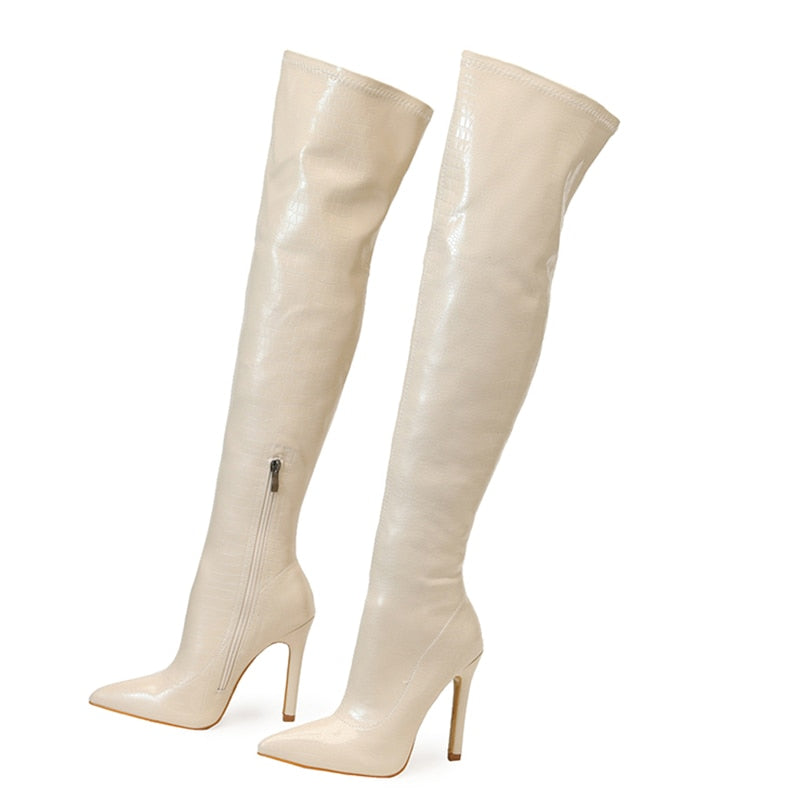 - Glamorous and chic you are bound to get noticed walking into the room with these gorgeous over-the-knee thigh high boots. Super soft and comfortable they are made of high quality PU leather and feature pointed toe, side zip up closure and seam detailing, perfect for evenings out, or any special event or occasion they are sure to please.