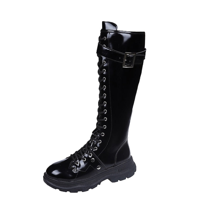 - Made from quality faux PU patent leather and featuring chunky, cleated, anti-skid rubber soles, round toes, lace-up and side zip up closure, decorative buckle strap, and seam detailing, these combat style boots will be sure to please.