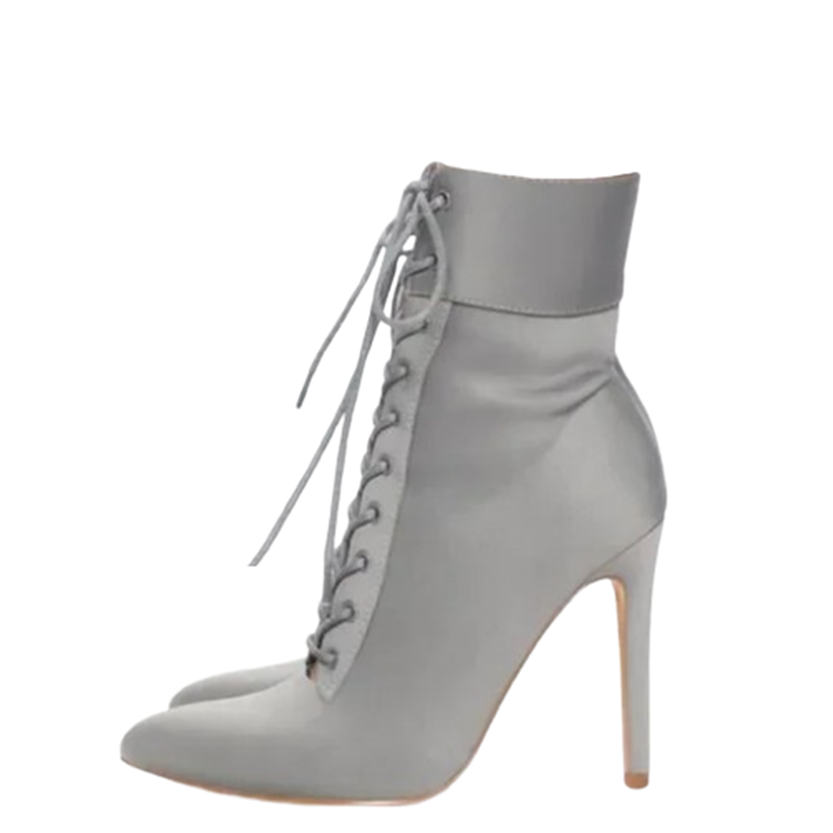 - Made from quality faux PU leather and featuring elegant refined, design, with pointed toes, lace up zip up closure, anti-skid ridged rubber soles, and finished with elegant high thin stiletto heels, these chic, feminine boots will be sure to please.