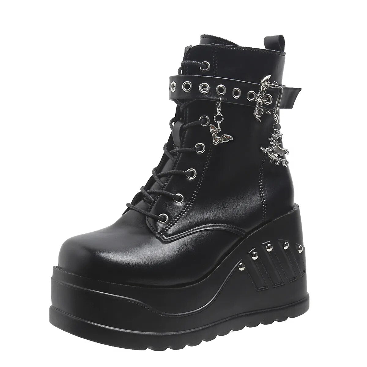 - Made from quality faux PU leather and featuring chunky, cleated, anti-skid platform rubber soles, round toes, decorative grommets, rivets, charms, outer lace up closure, single buckle strap design, inner side zip closure and seam detailing, these platform chunky boots are sure to please.