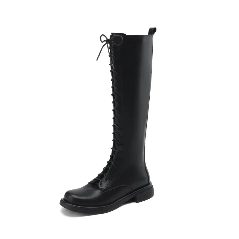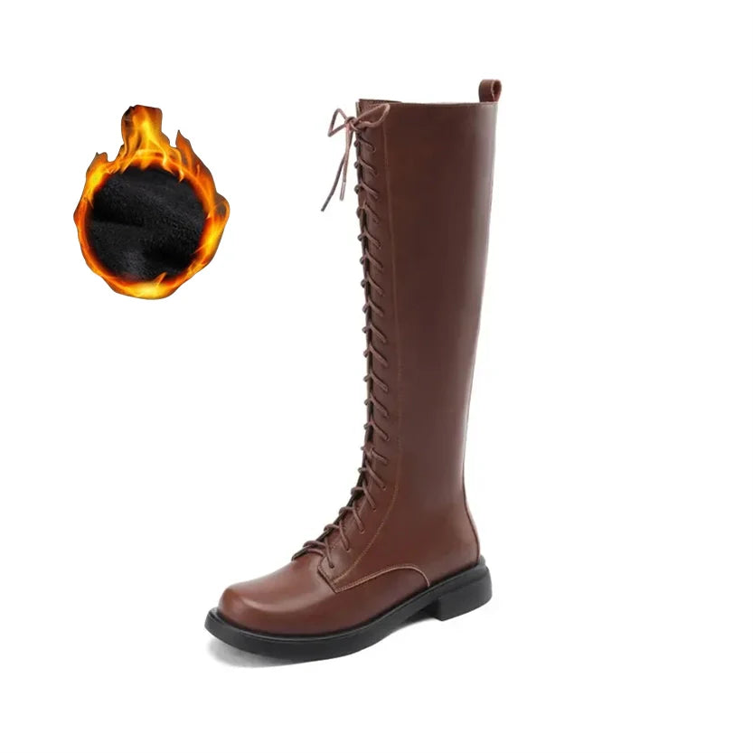 - These ladies, hand crafted, long boots feature front lace-up design, round toe, cushioned inner, square block heel, and anti-slip rubber soles. The adjustable shoelaces ensure a secure fit, while the subtly padded footbed offers comfort for all-day wear. So comfortable you will feel like you're walking on air. Low heels ensure these boots are easy to walk in, you will want to wear them all day, every day.