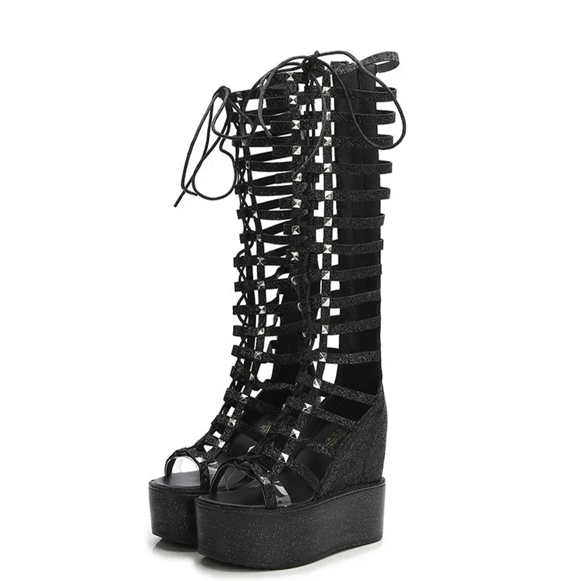 Looking to make a fashion statement? Then you can't go wrong with these awesome knee high Roman Gladiator chunky wedge heels