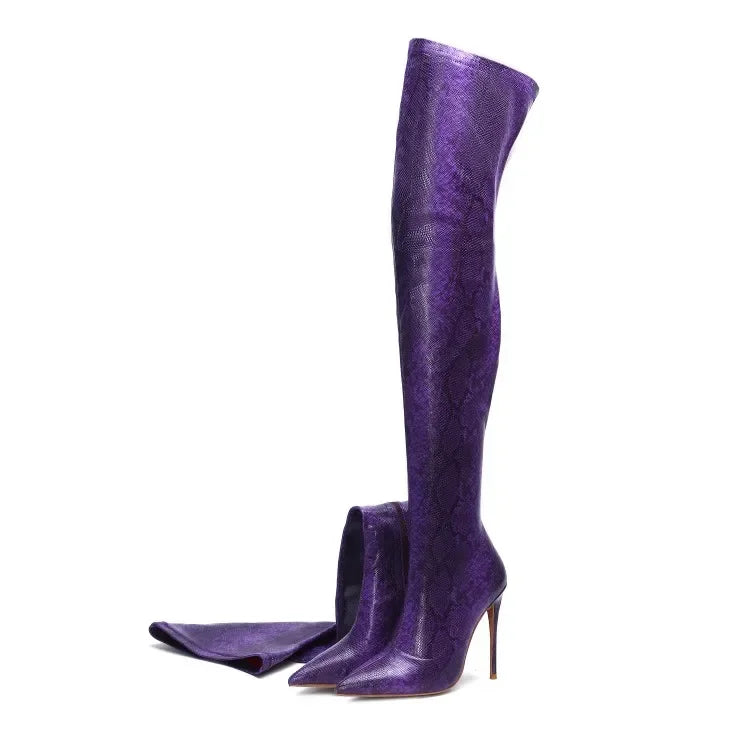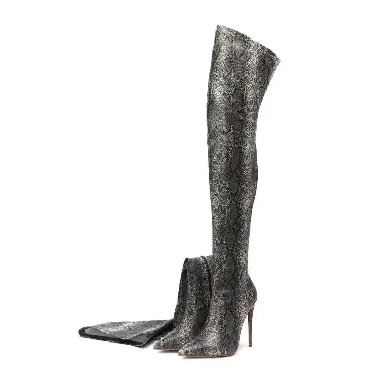 - Glamorous and a bit risque' you will get noticed walking into a room with these gorgeous over-the-knee high boots. Super soft and comfortable they are made of quality PU leather and Soft Stretch fabric and feature pointed toe, super high stiletto heel, pull on closure with side ankle zip, snake print, leopard print, boho and floral print design, and non-slip rubber soles.