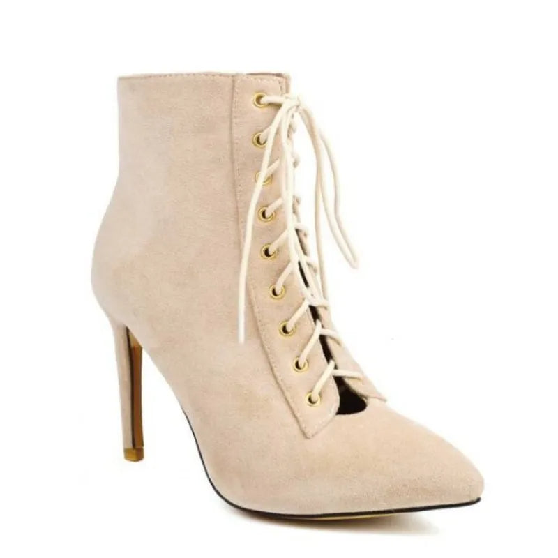 - Made from quality faux PU Suede leather and featuring elegant refined, design, with pointed toes, lace up zip up closure, anti-skid ridged rubber soles, and finished with elegant high thin stiletto heels, these chic, feminine boots will be sure to please.