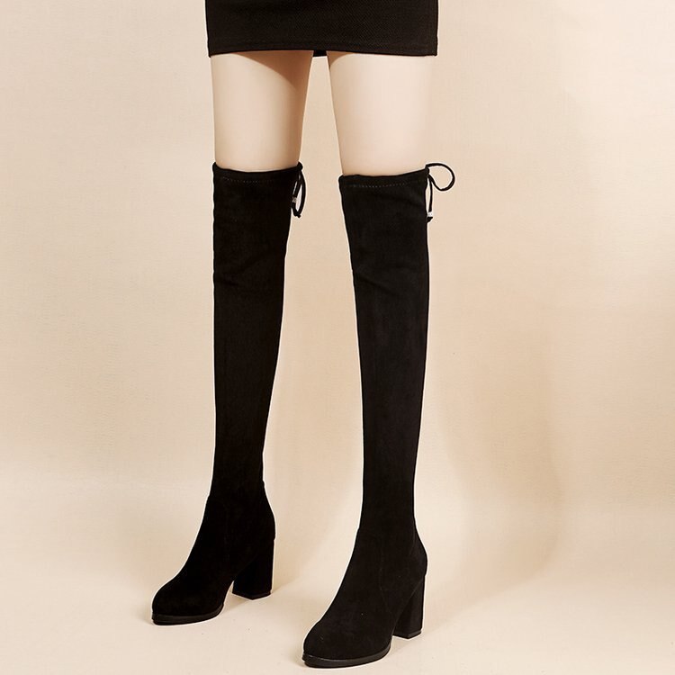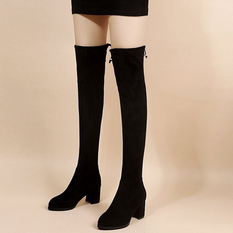 - Glamorous and a bit risque' you will get noticed walking into a room with these gorgeous over-the-knee skinny boots. Super soft and comfortable they are made of quality Suede PU leather and feature round toe pull on design with tie closure and seam detailing
