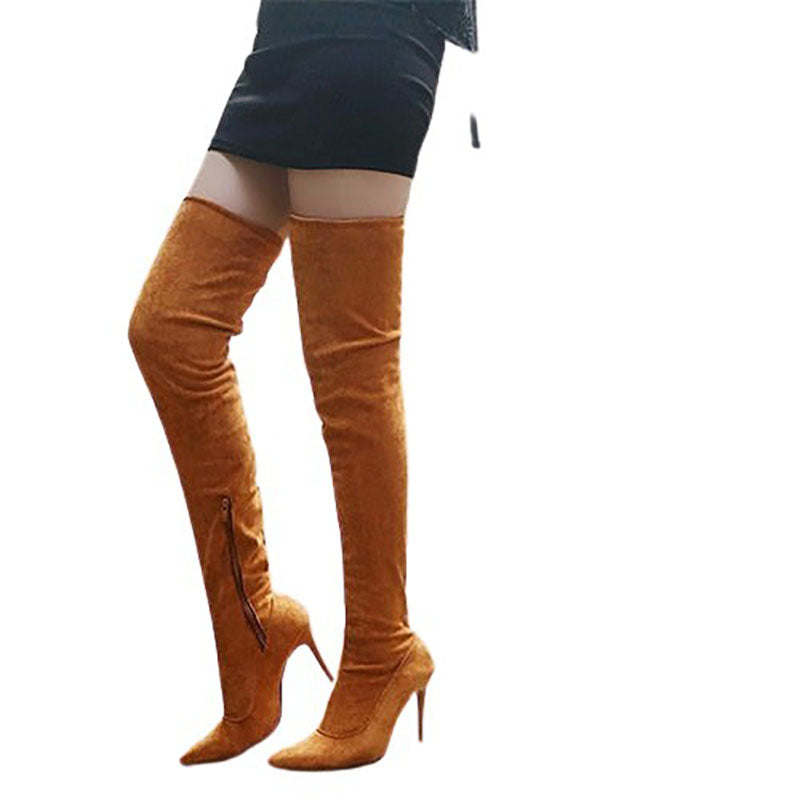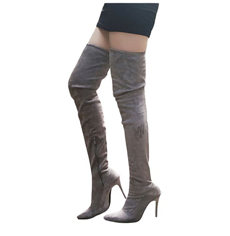 - Glamorous and a bit risque you will get noticed walking into a room with these gorgeous over-the-knee stiletto boots. Super soft and comfortable they are made of quality Suede PU leather and feature pointed toe, pull on design, seam detailing and reinforced elastic knee area.