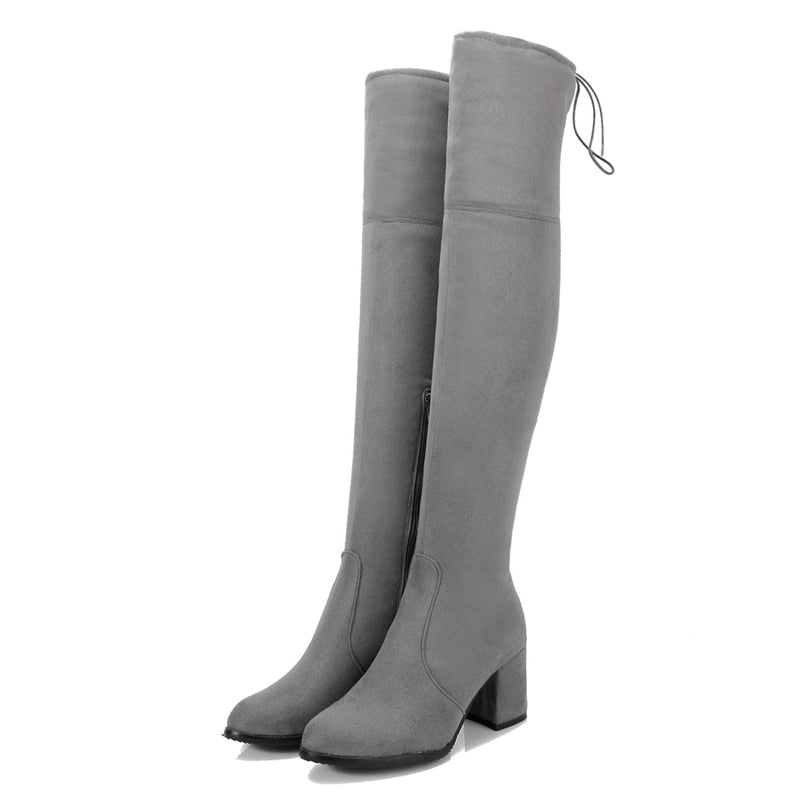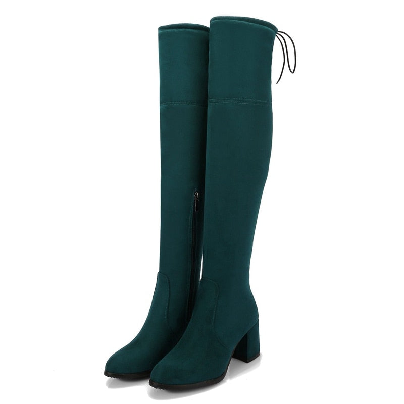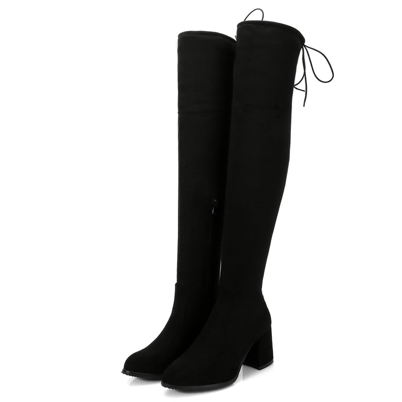 - Glamorous and a bit risque' you will get noticed walking into a room with these gorgeous over-the-knee skinny boots. Super soft and comfortable they are made of quality Suede PU leather and feature round toe pull on design with tie closure and seam detailing
