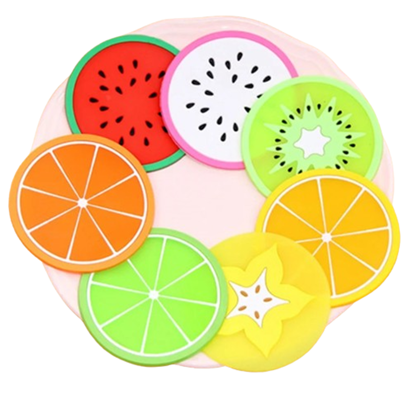 - These colorful fruit design drink coasters are perfect to protect any surface while you enjoy your beverage. Made of stain-resistant, non-abrasive silicone that is strong, durable and heat-resistant to 482 degrees F, our cup Coasters will not break if dropped, or scratch surfaces the way hard coasters do.
