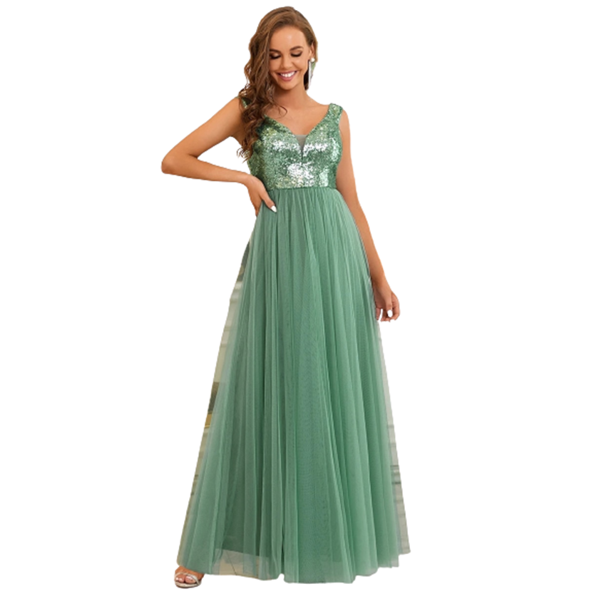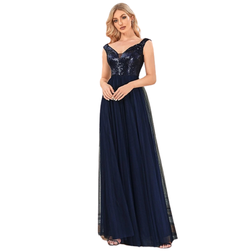 - Featuring sleeveless, backless design with wide sequined shoulder straps that shows off a dramatic V neckline, a fitted sequined bodice that is tapered and cinched at the waist, a high waist and an A line floor length floaty design, this elegant dress will have you feeling truly special at any occasion.