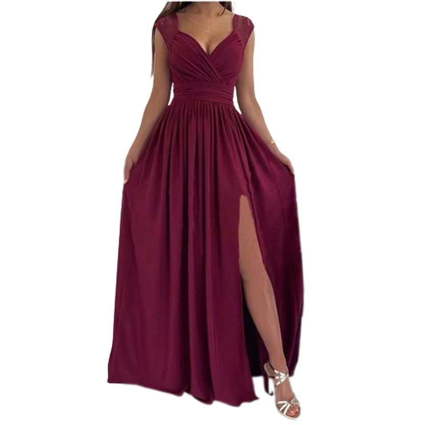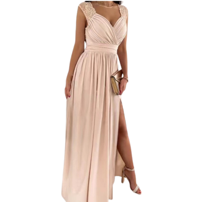 - Featuring sleeveless, backless design, wide lace shoulder straps that shows off sweetheart neckline, 3D draping, fitted high waist, ankle length full draped skirt with risque' high thigh split to show of those legs. This elegant and classy dress will have you feeling truly special at any occasion.