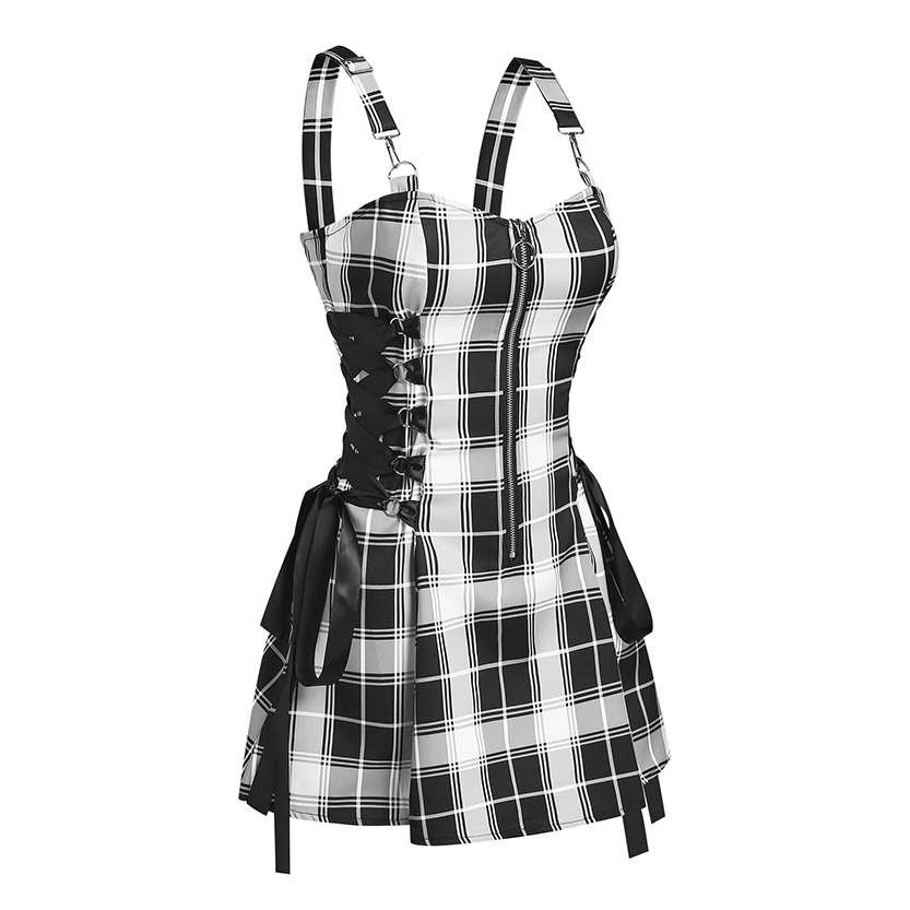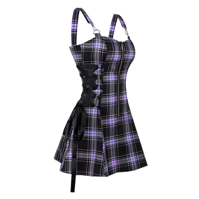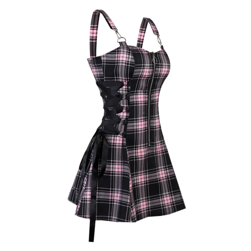 - Oozing personality this little checked dress has a lot to say. Featuring adjustable spaghetti shoulder straps with metal clasps that shows off a subtle sweetheart neckline, an A line skirt with high waist, O ring zip up front. sleeveless open back and lace up side and a daring thigh high length hemline this Harajuku Plaid Mini Dress is a cute and stylish casual dress that you'll look adorable in.