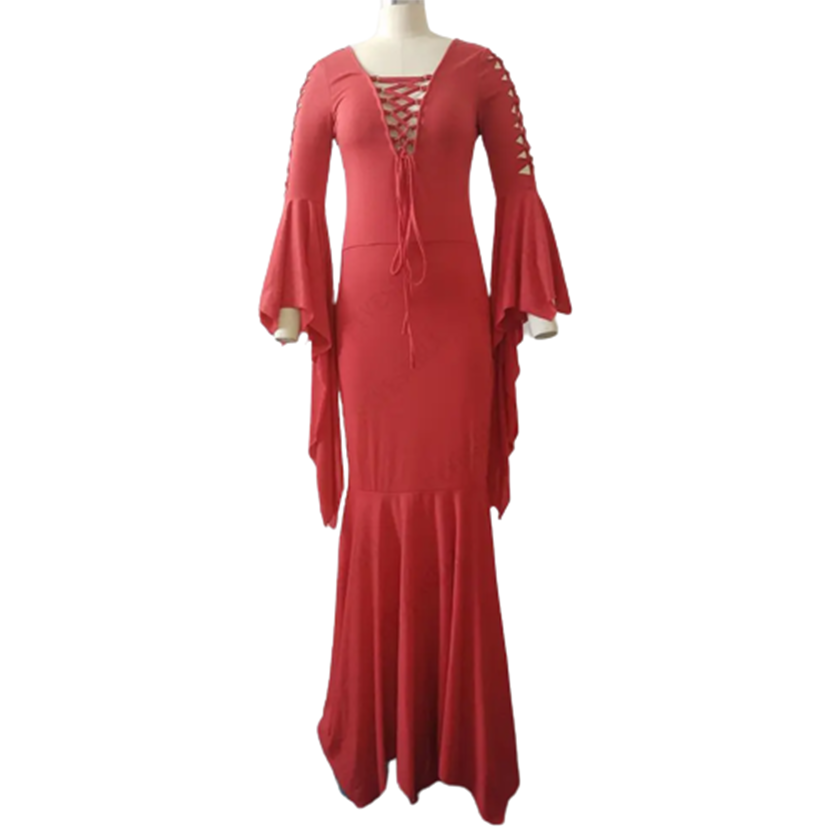 - Featuring long butterfly sleeves with decorative cut out criss cross upper arms, and plunging V neckline, pull on closure, tapered high waist to show of those womanly curves, soft figure hugging skirt that drops gently from the hips, and a full floor length mermaid hemline, this wickedly bold dress is bound to get you compliments.