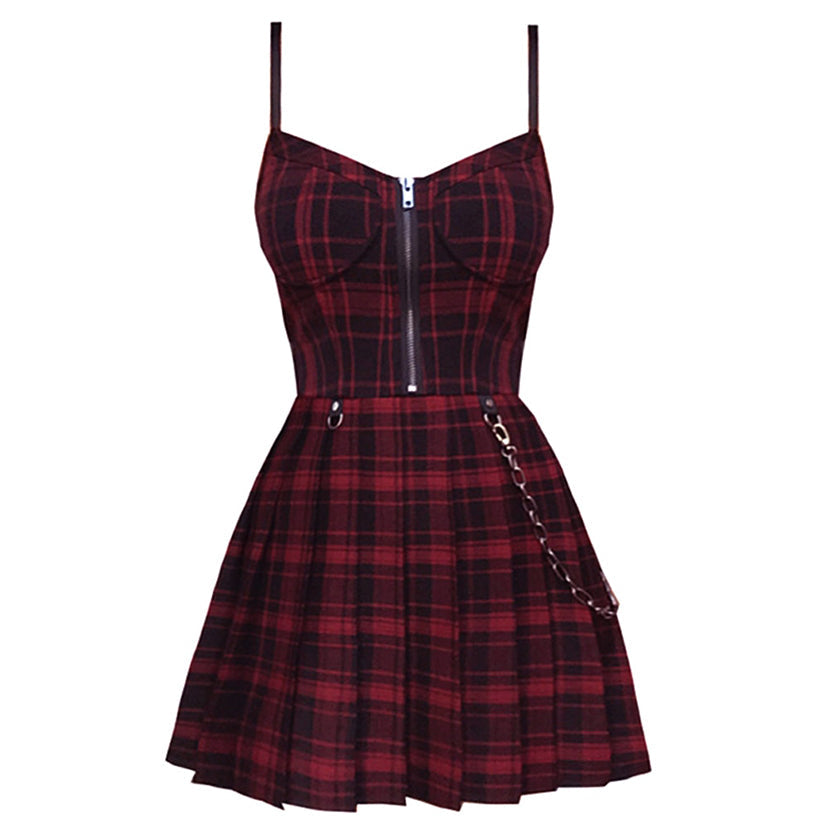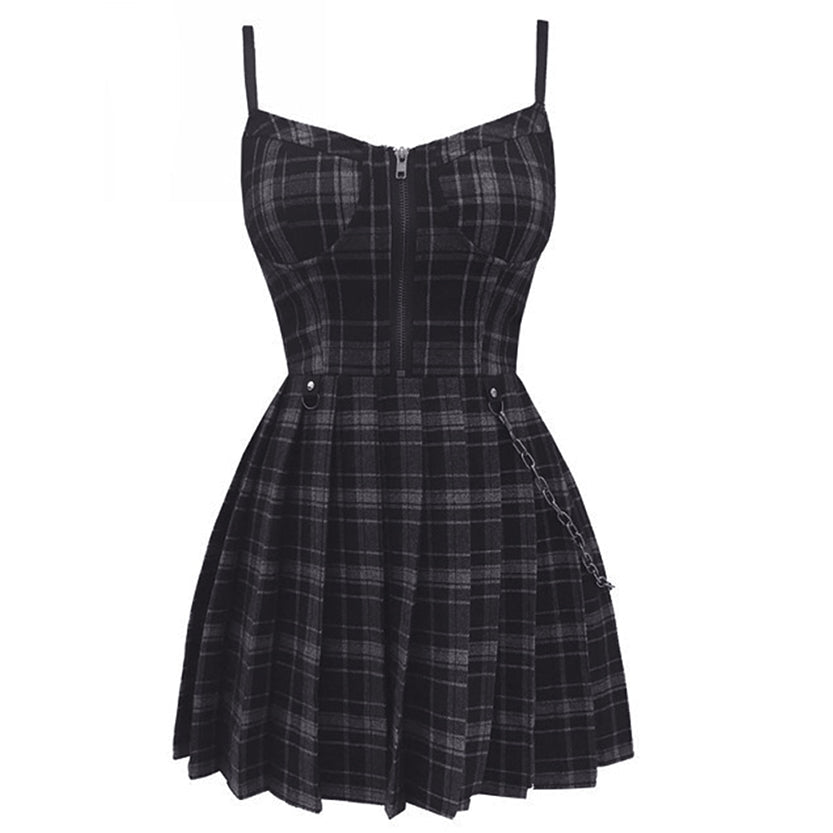 - Oozing personality this little checked dress has a lot to say. Featuring spaghetti shoulder straps that shows off a subtle sweetheart neckline, an A line skirt with high waist, front zip up closure. sleeveless open back and thigh high length hemline this Harajuku Plaid Mini Dress is a cute and stylish casual dress that you'll look adorable in.