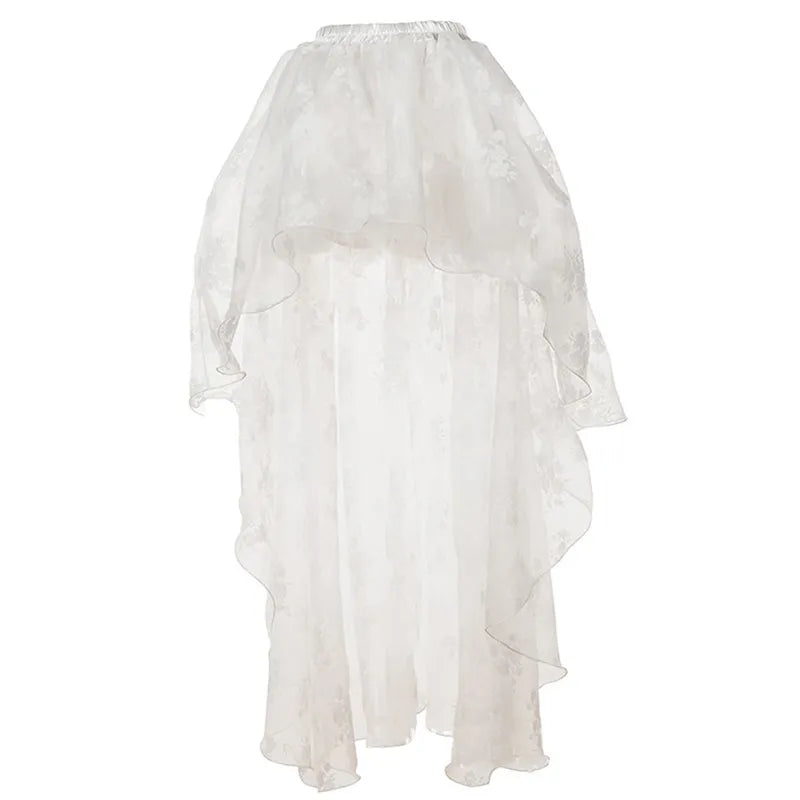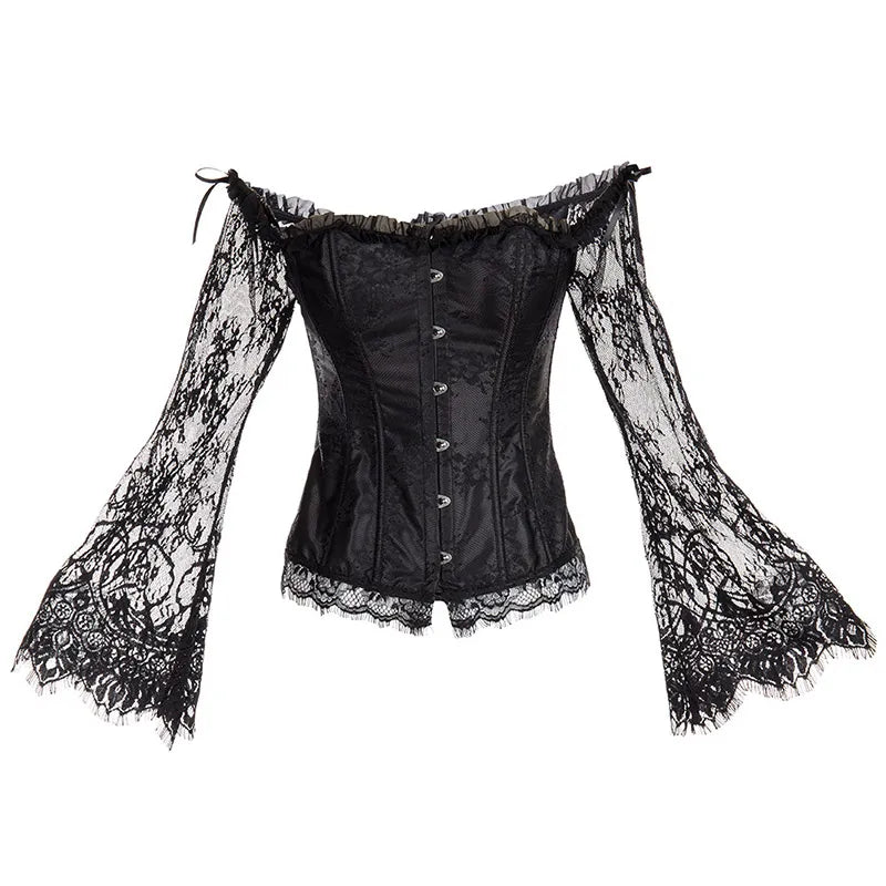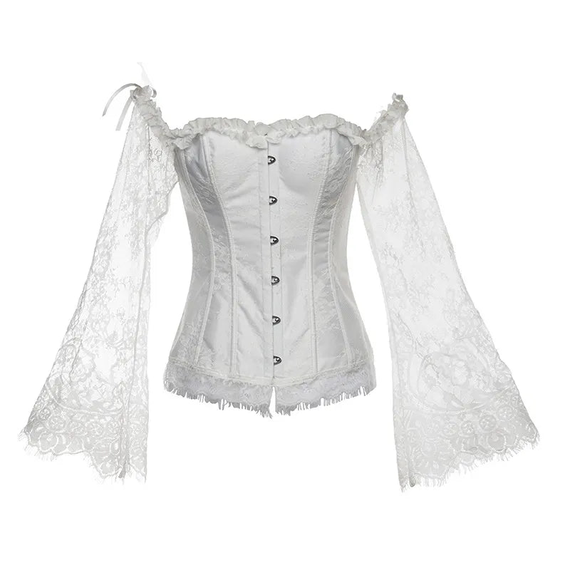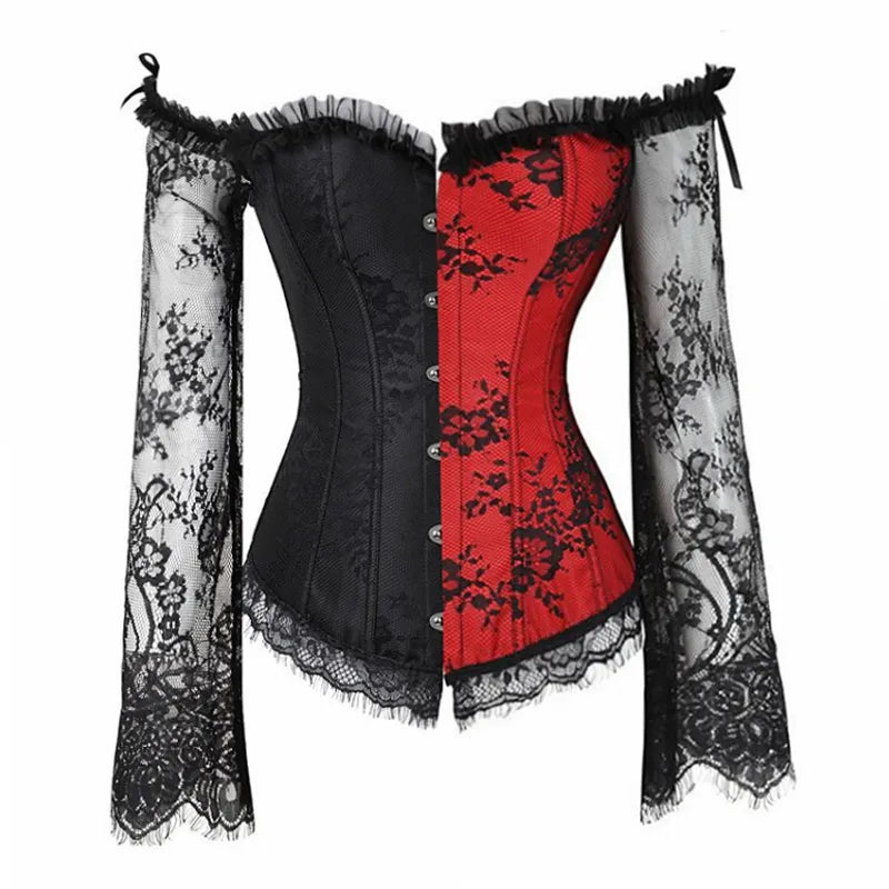 - Featuring elegant off the shoulder design, long lace embroidered sleeves, fitted, front button up and hook and eye bodice, that cinches the waist to show off those womanly curves, open neckline, to emphasize a girl's assets! Short mini under skirt with a pretty floral lace overlay, and high/low uneven floaty hemline these retro Victorian style bustier and skirts sets are bound to get you compliments.