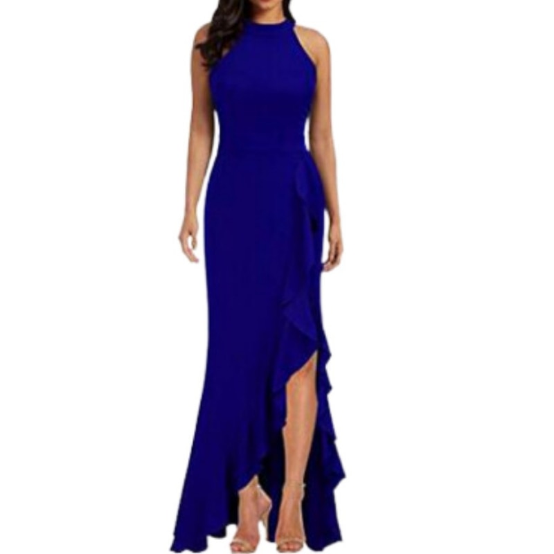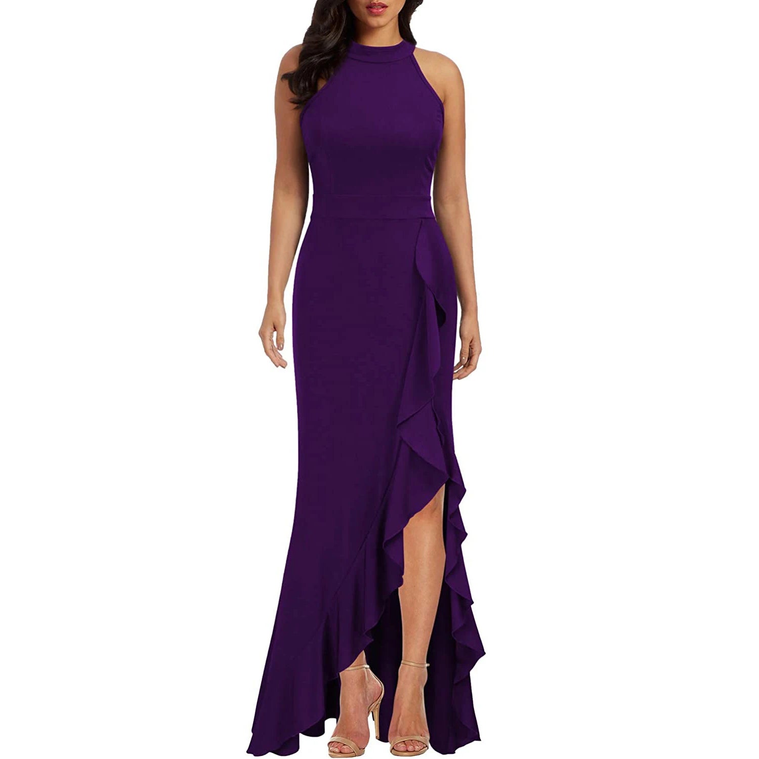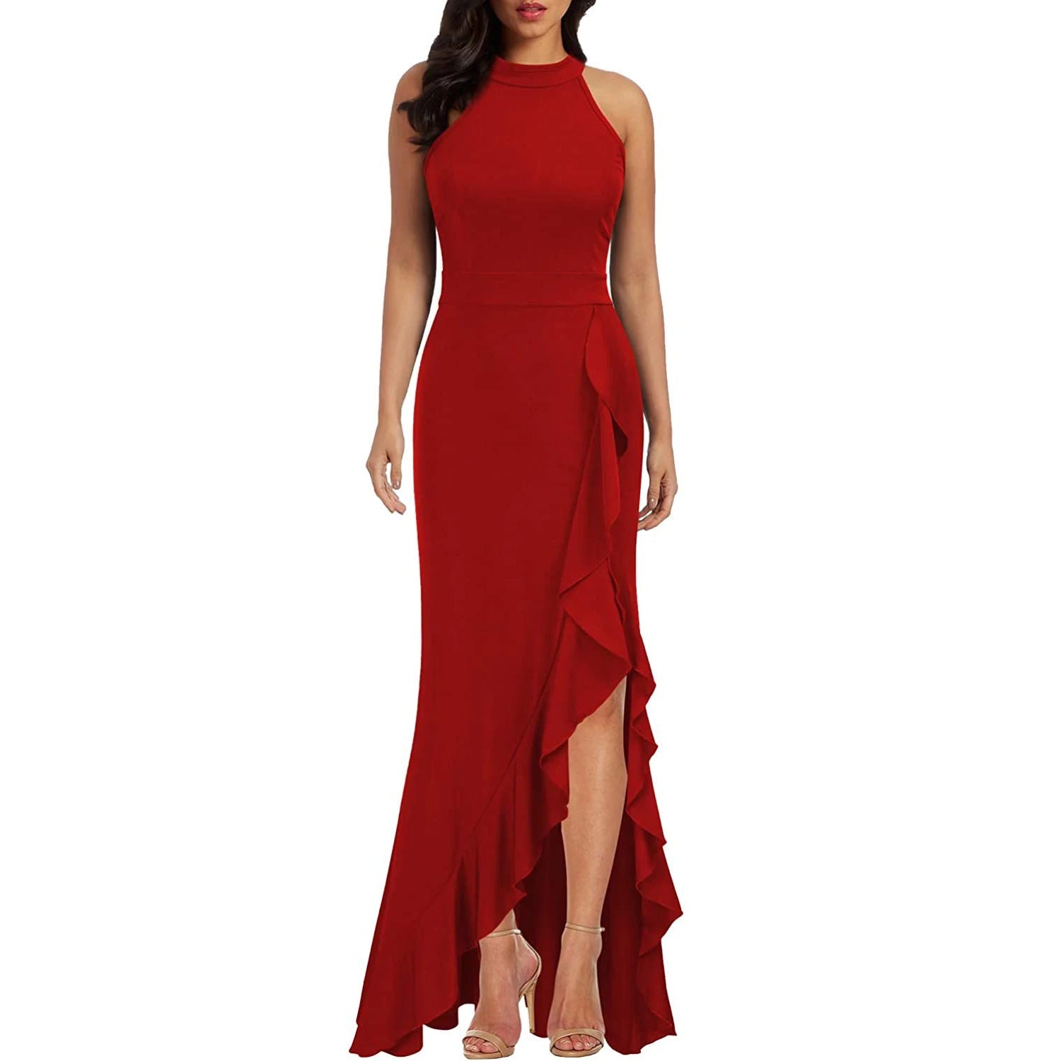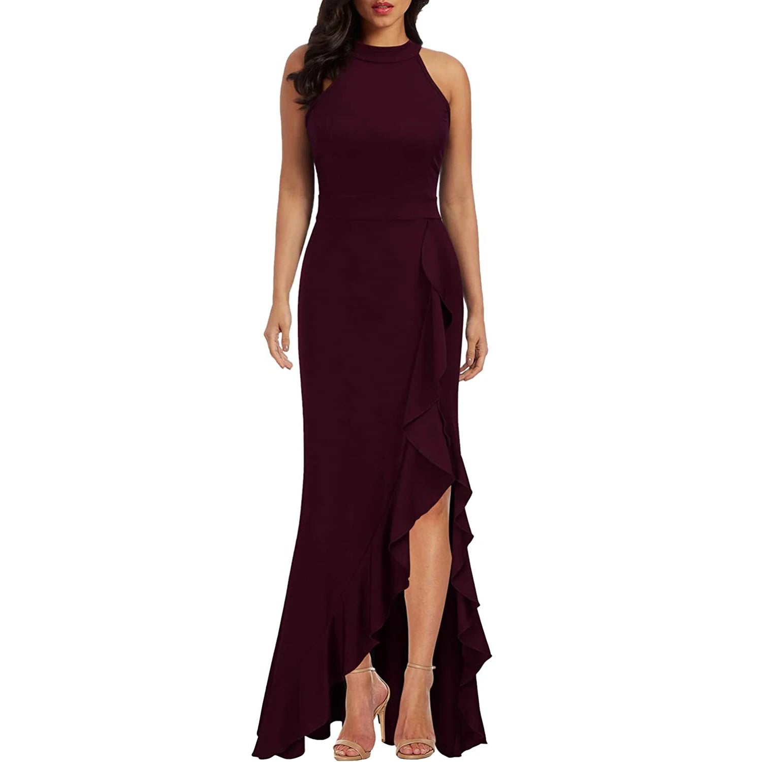 - Featuring sleeveless halter neck design with, fitted bodice, cinched and tapered at the waist, figure hugging form fitting skirt with side split and ruffles, high waist, and a floor length hemline this elegant dress will have you feeling truly special at any occasion.
