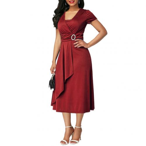 - The party dress features sweet capped short sleeves that shows off a v shape neckline, a high waist, A line skirt that is cinched at the waist with a graceful decorative diamante clasp, a wrap style front cross over skirt with generous fit and below the knee length floaty design. Stylish and elegant this cocktail party dress will have you feeling truly special on every occasion.