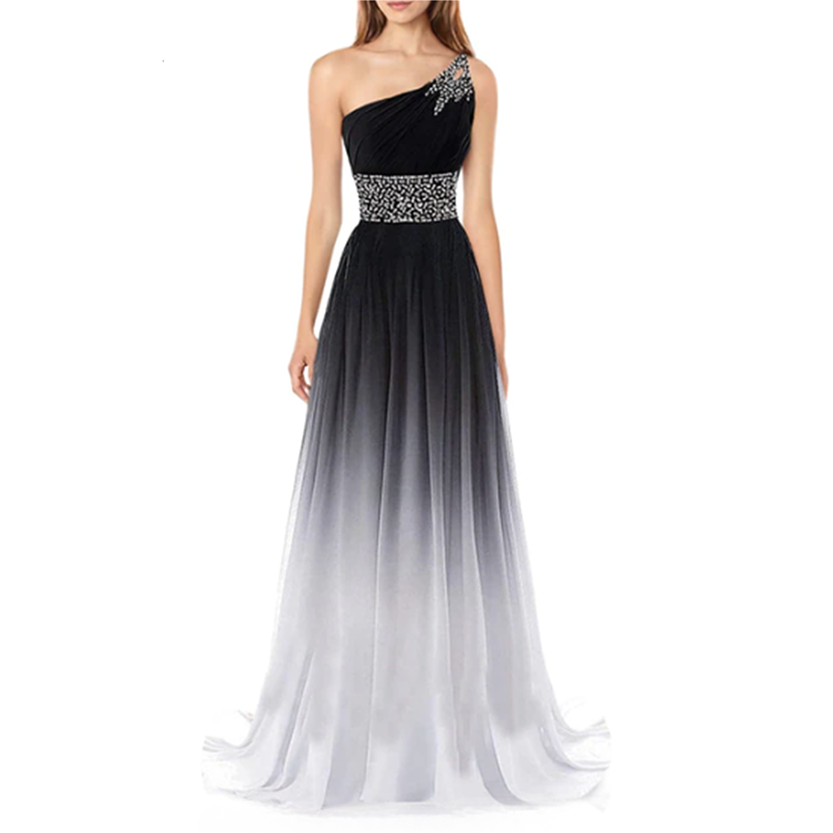 - Featuring sleeveless one shoulder design with elegant beaded strap that shows off an angled neckline, fitted bodice, cinched and tapered high waist with stunning beaded band, a floaty A line floor length skirt this stunning dress will have you feeling truly special at any occasion.