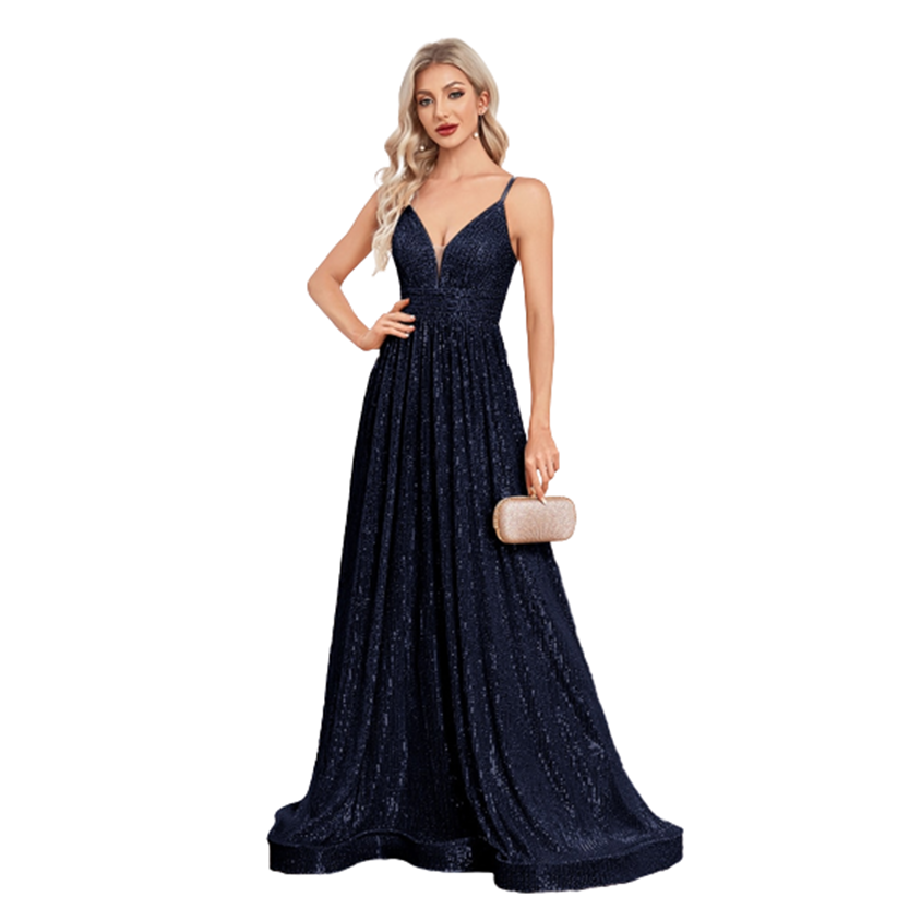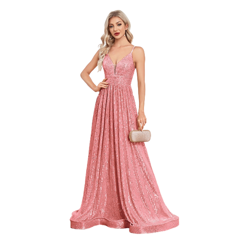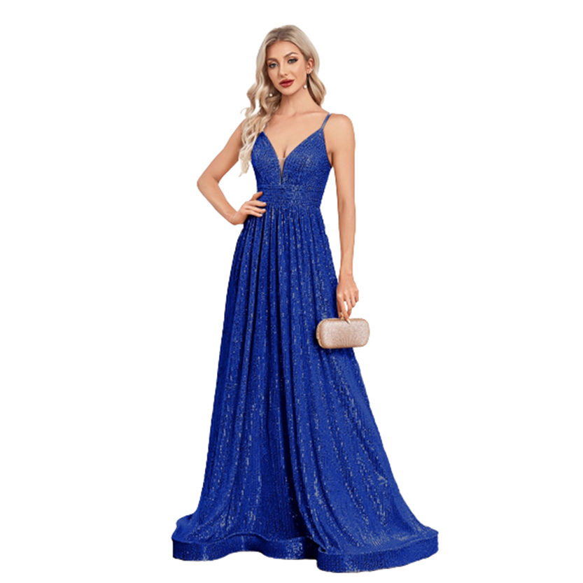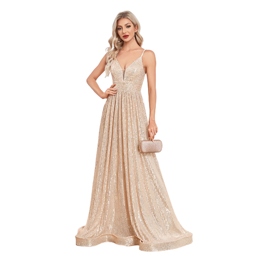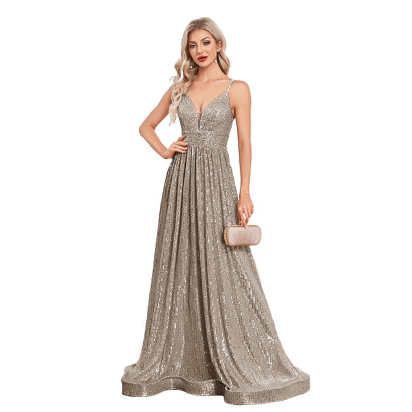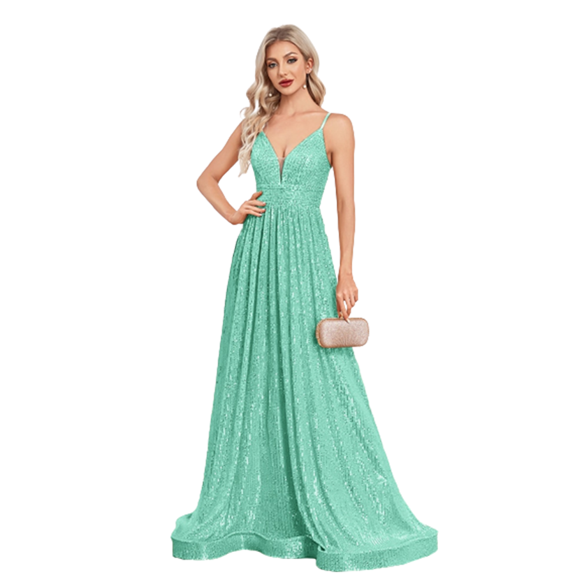 - Featuring sleeveless, backless design with thin sequined spaghetti shoulder straps that shows off a dramatic V neckline, a fitted sequined bodice that is tapered and cinched at the waist, sweep train, high waist and an A line floor length floaty design, this elegant dress will have you feeling truly special at any occasion.