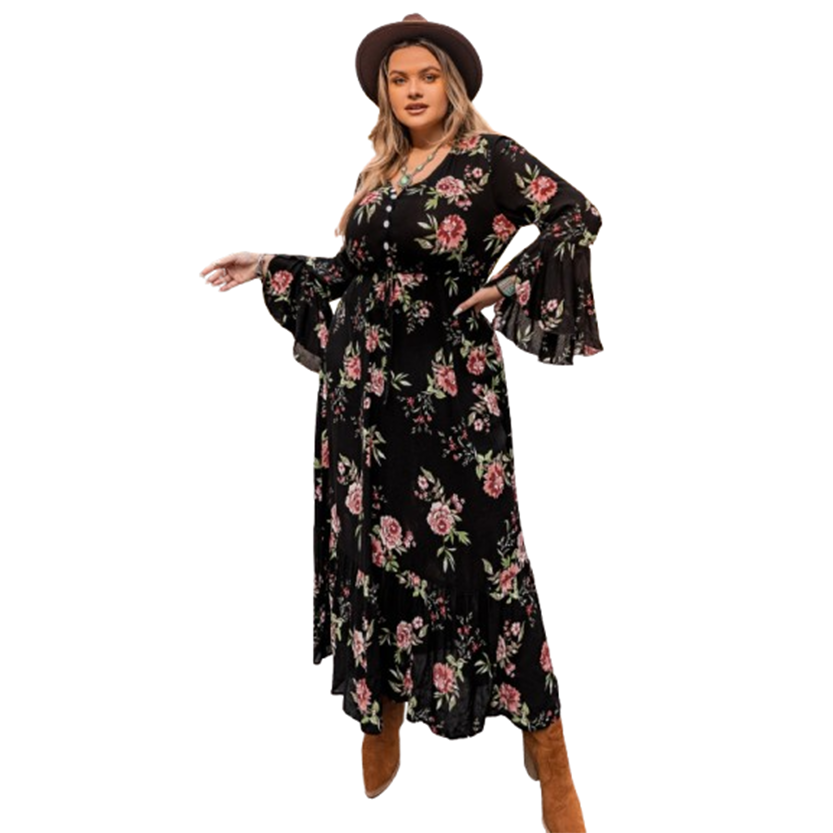 - Featuring pretty floral generous design with long flared sleeves, that show off a subtle round neckline. High waist, button up bodice, A line ankle length hemline these elegant dresses will have you feeling truly special at any occasion all summer long.