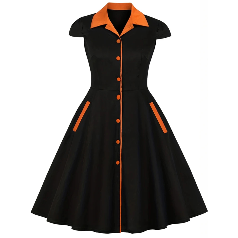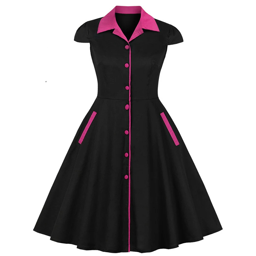 - Featuring short capped sleeves, contrasting color design, turn down collar that shows off a subtle V neckline, decorative buttons, zip up closure, full pleated A line skirt with high waist, and knee length hemline this stylish pin up dress is bound to get you compliments.