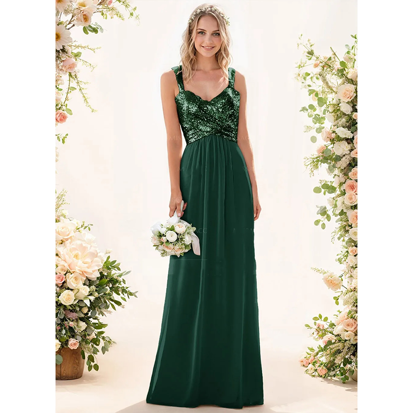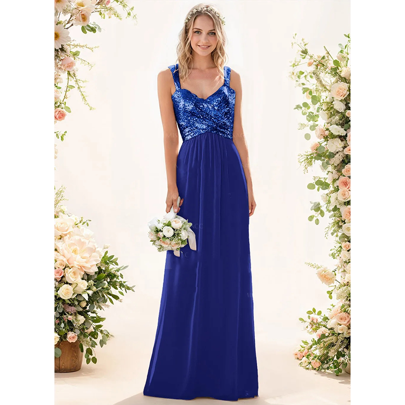 - Featuring sleeveless, backless design with wide sequined shoulder straps that shows off a dramatic V neckline, a fitted cross over sequined bodice that is tapered and cinched at the waist, a high waist and an A line floor length floaty design, this elegant dress will have you feeling truly special at any occasion.