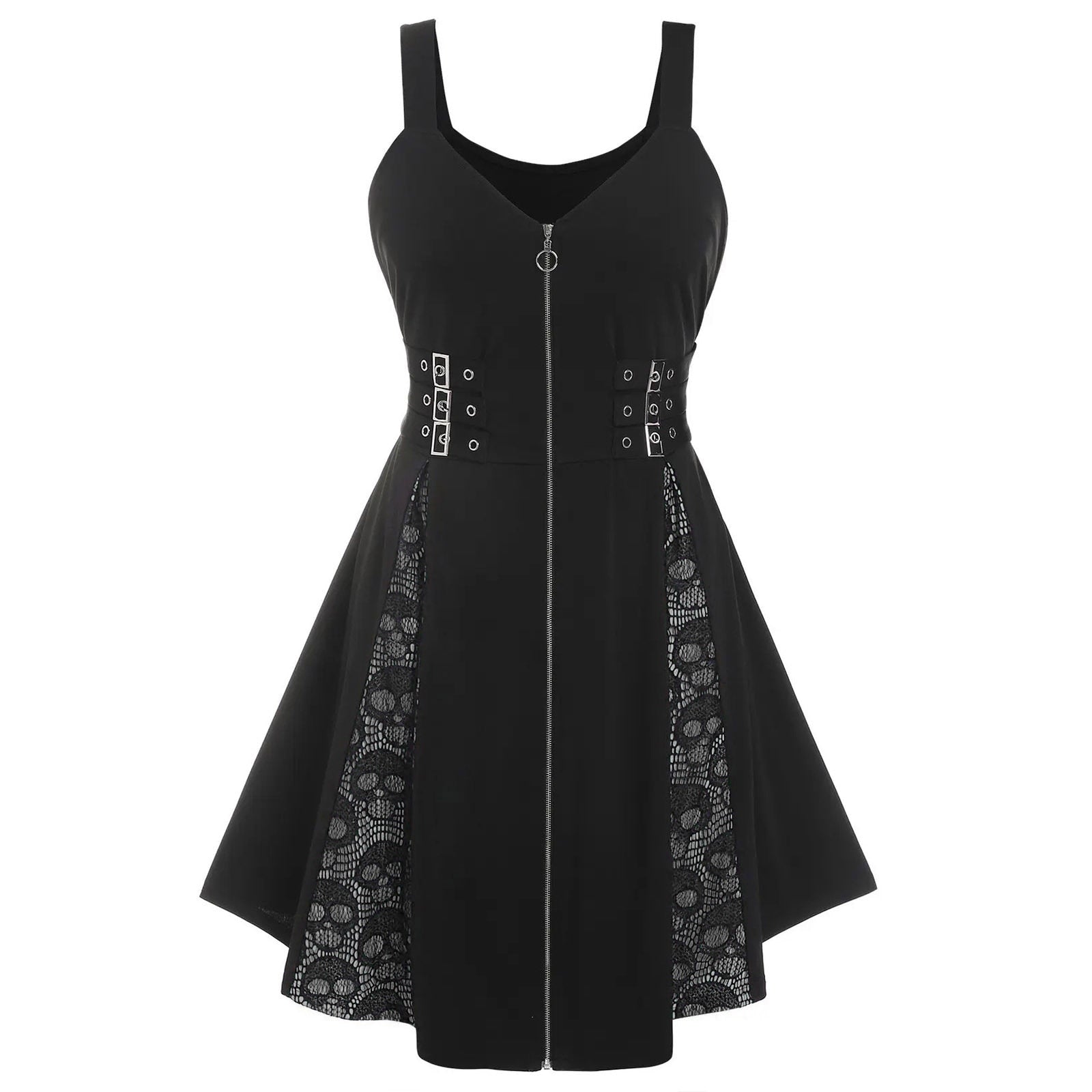 - Featuring sleeveless, backless skull pattern design, thin spaghetti straps that shows off a subtle V neckline, decorative buckled and belted high waist, front zip up closure, full pleated A line skirt with an above the knee mini hemline, this stylish punk dress is bound to get you compliments.