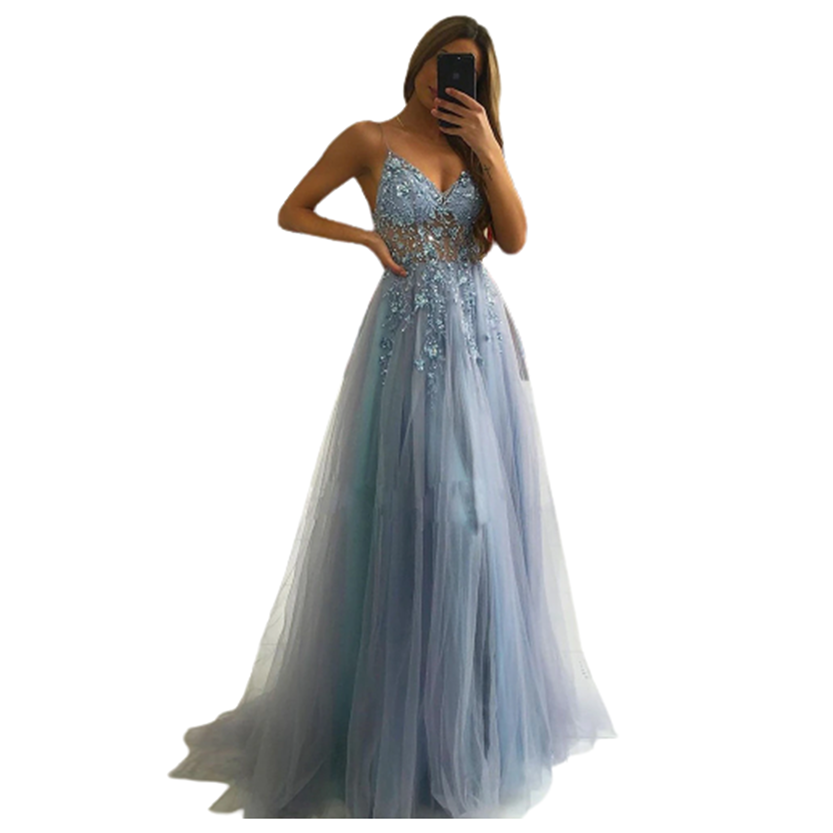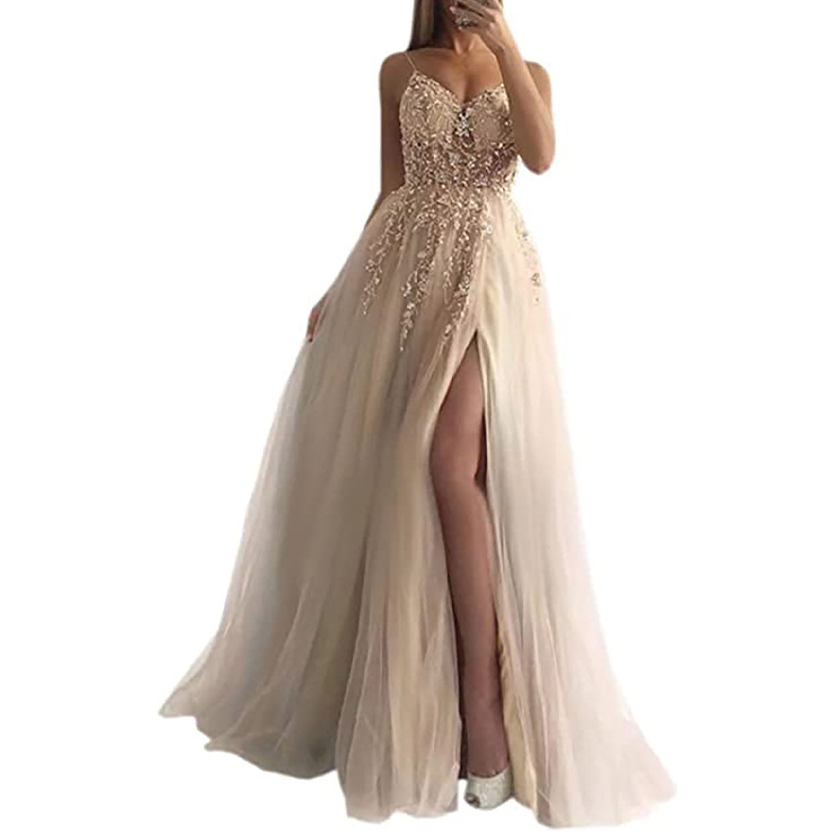 - Featuring beaded spaghetti straps that shows off a dramatic V neckline, a fitted embroidered lace bodice that is tapered at the waist, a high waist and an A line floor length floaty design, this elegant dress will have you feeling truly special at any occasion.