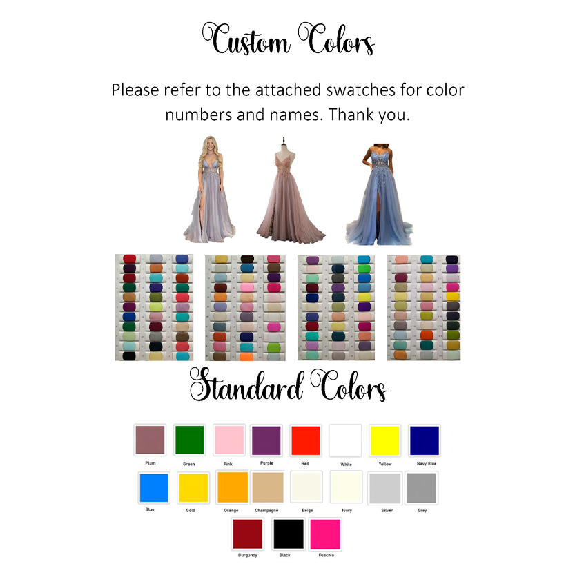 Please download and complete the Customization Form and record your measurements, style, color, and size preferences and any additional information. Then, upload the form at checkout. Thank you.