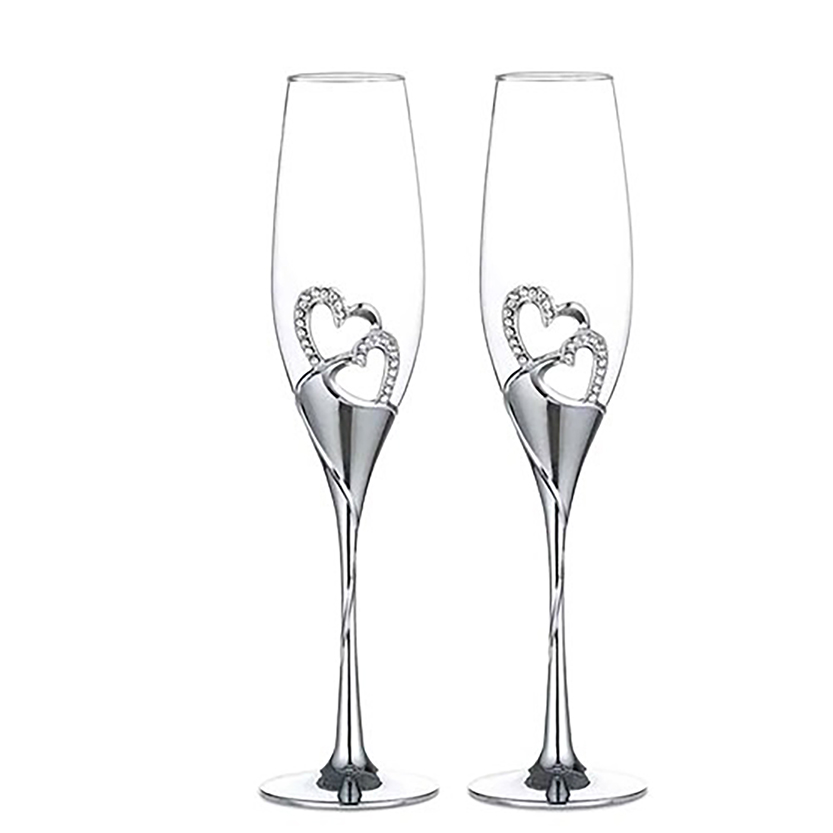 - Beautiful and elegant in design with long stems, silver plated finish, his and her romantic double entwined love hearts encrusted with 25 sparkling rhinestones on each glass, a solid base and classic flute design to keep your champagne sparkling and bubbling to the last drop they are ideal to mark any special occasion.