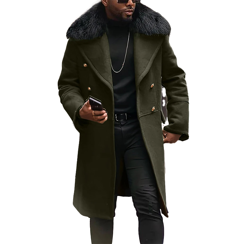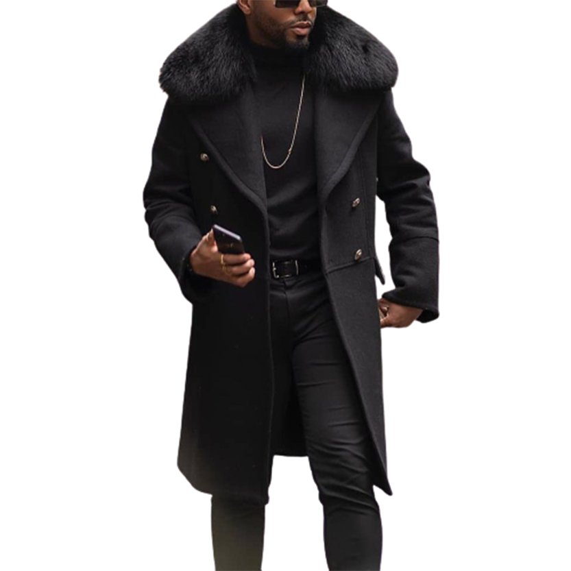 - Our classic slim fit pea coat features 4 button double breasted front closure in breathable wool blend/micro fiber fabric with faux fur turn down collar, Elegant and stylish this high end luxury coat will keep you looking great and feeling warm while showcasing your individuality.