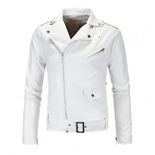 - This classic biker style jacket is available in 3 colors, black, white and coffee and features classic motorcycle jacket elements such as tapered belted and buckled waist, zippered front closure, cuffs and sleeves, 1 front button down pocket, 1 decorative top zip pocket in soft PU leather. It will keep you warm while showcasing your style and individuality.