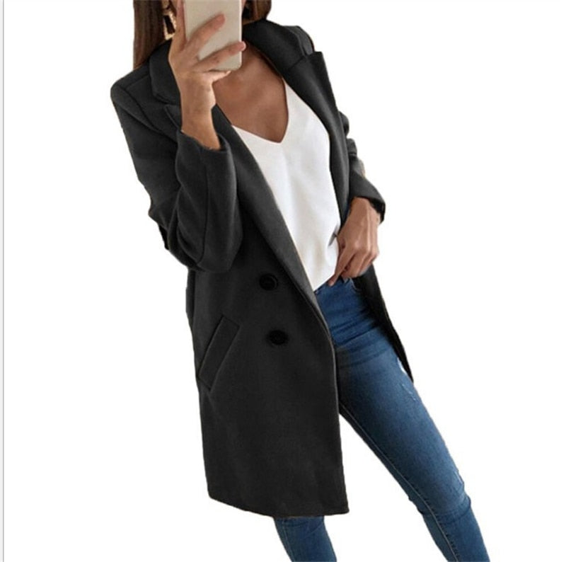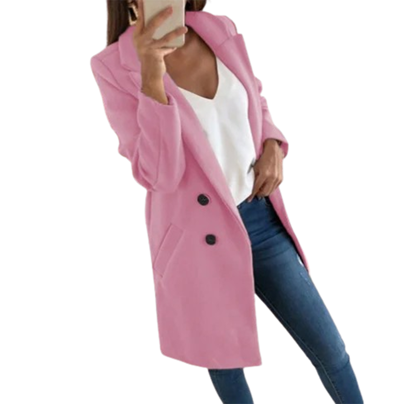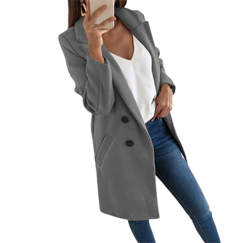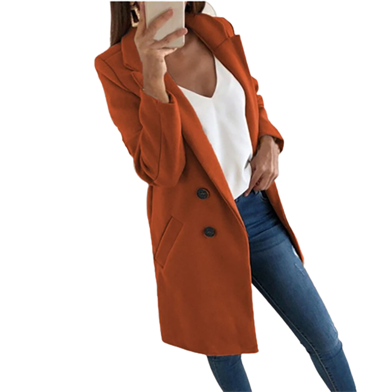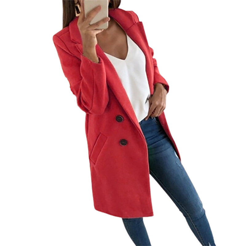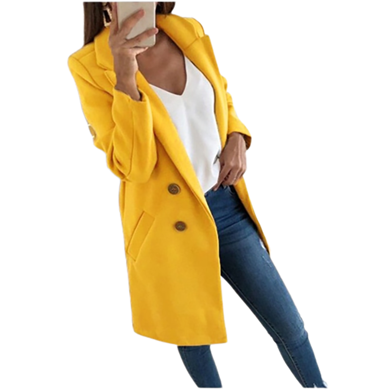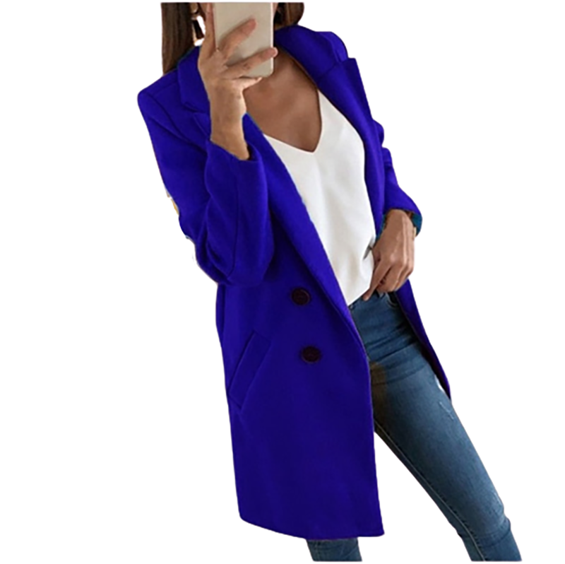 - This women's autumn and winter casual warm single-breasted calf-length windbreaker woolen coat Jacket features a slim fit style 2 button closure with side angled decorative pockets in a variety of bold colors. Warm and cozy to keep out the cold. Perfect for windy, wintery days.
