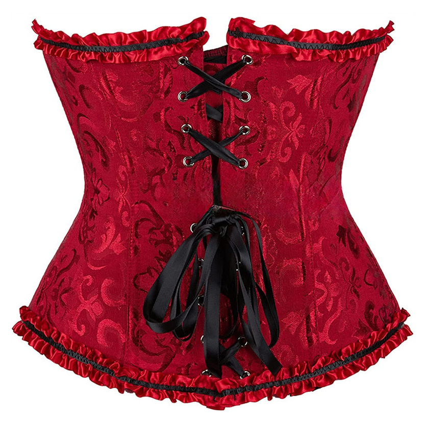 - Featuring a sexy french maid, steampunk or gothic punk look with a fitted embossed floral satin bodice that tapers at the waist. Lightweight breathable material that is cool to wear and soft to the touch. Available in 2 styles - front hook and eye closure and front zip closure. Flexible plastic boning for support and comfort. Soft ruffles along the bustline and across the hem with a pretty bow at the centre of the cleavage. This adjustable fit, slimming corset, suits most body types comfortably as it laces up at the back so you can tighten or loosen the fit to suit your needs. All materials are carefully selected to ensure that our corsets are durable and comfortable to wear. You will hardly know you are wearing one!