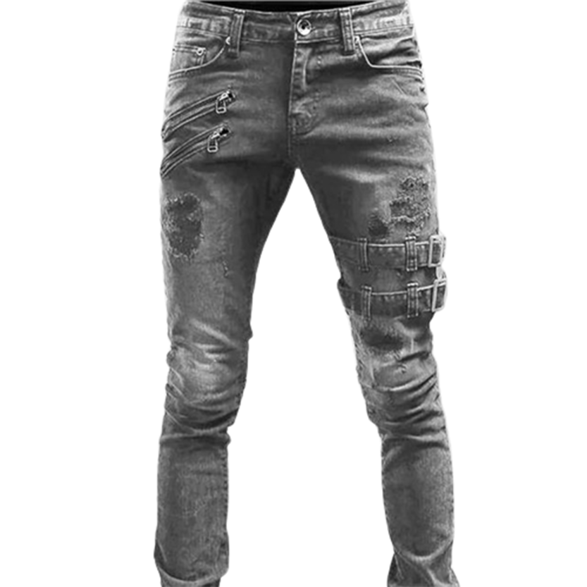 - Featuring fly button, zip closure with decorative front zippers, and side buckle straps, elasticized waste, skinny slim fit design in stretch fabric these pants provide a relaxed but secure and comfortable fit. Soft, breathable, lightweight material ensures that these full length distressed ripped jeans in solid colors with seam detailing they are sure to impress.