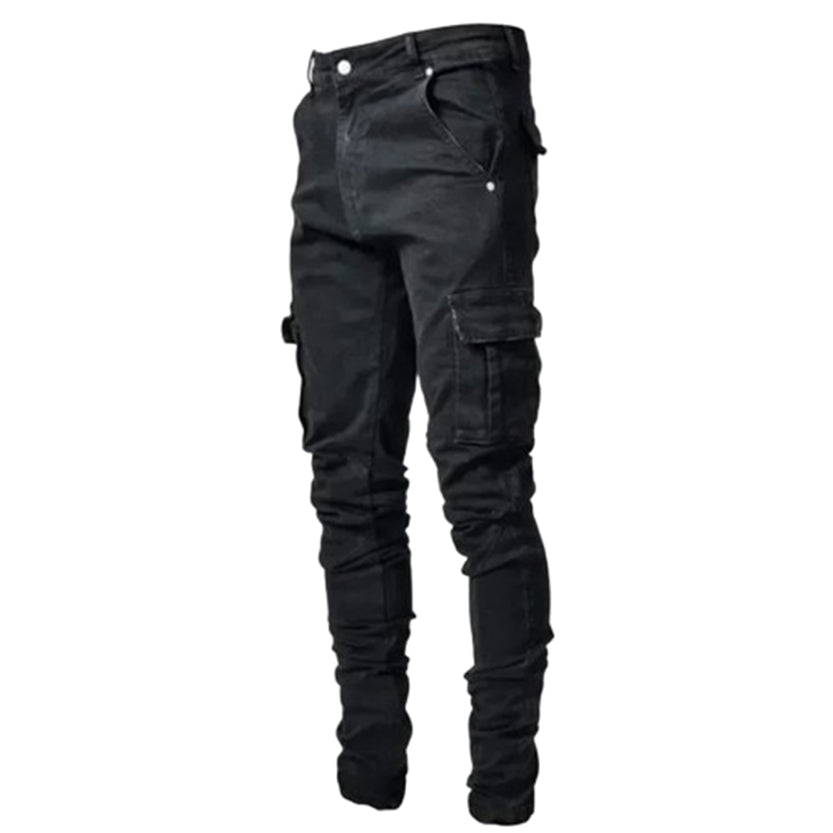 - Featuring fly button, zip closure and long side pockets, elasticized waste, skinny slim fit design in stretch fabric these pants provide a relaxed but secure and comfortable fit. Soft, breathable, lightweight material ensures that these full length distressed ripped jeans in solid colors with seam detailing they are sure to impress.
